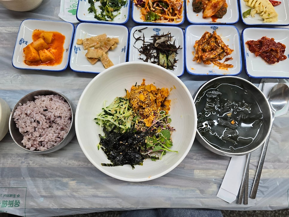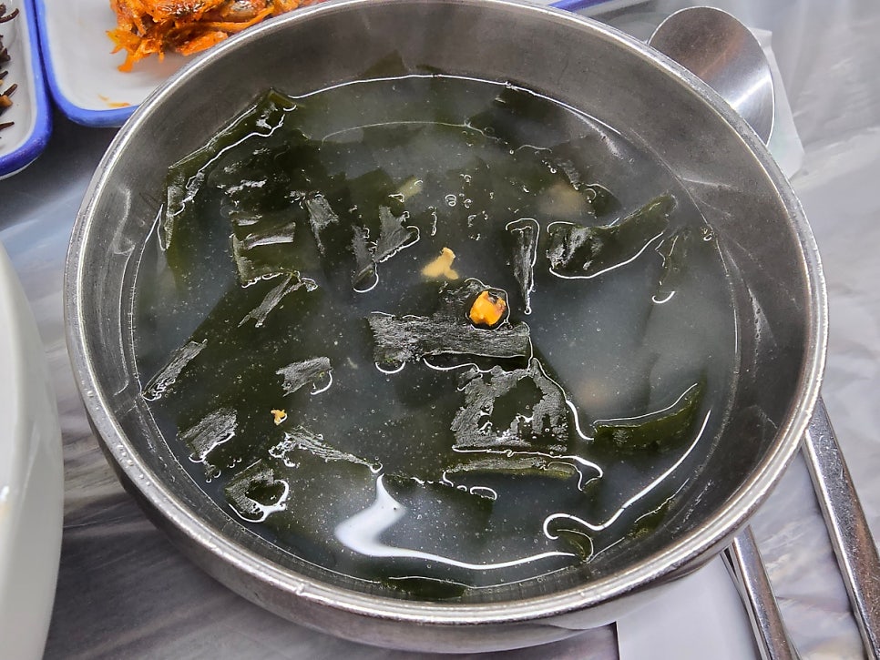 드디어 나온 멍게비빔밥! 원조밀물식당에서 워낙 멍게비빔밥을 맛있게 먹은터라, 기대 없이 먹었는데 오! 여기도 맛이 좋았다. 그리고 같이 딸려나온 미니 성게미역국, 미역국 넘 맛있었다.