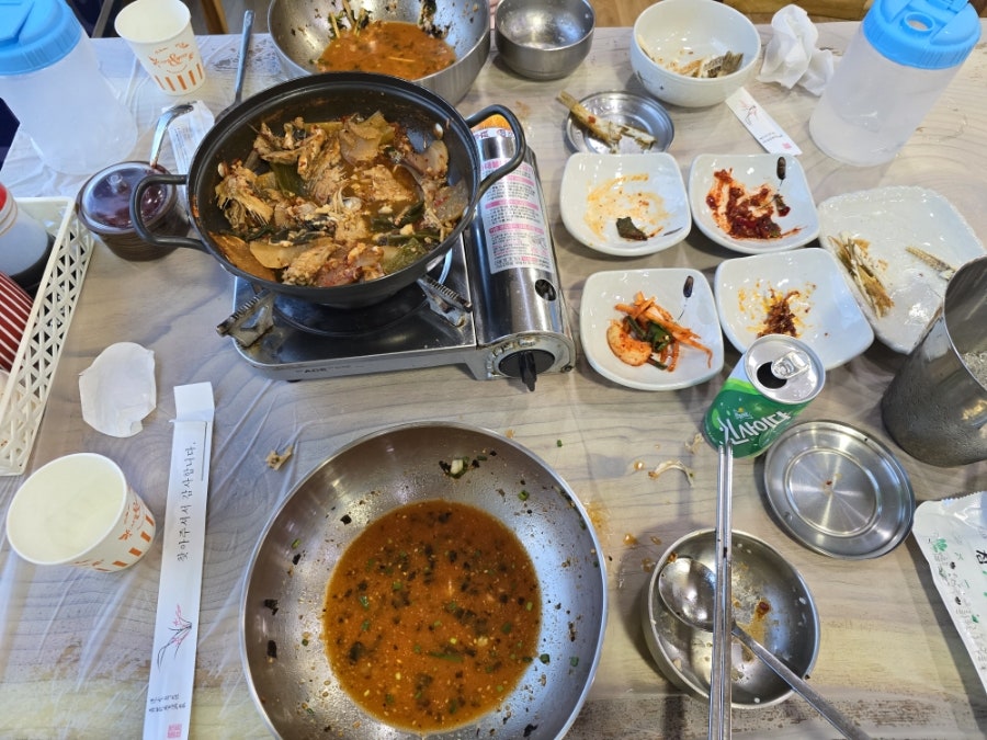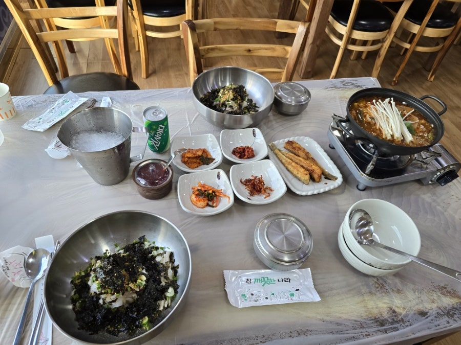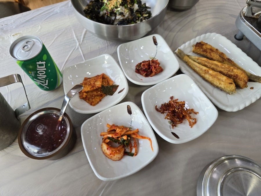 매운탕이랑 가자미물회랑 얼음 간거랑 사이다, 생선구이, 반찬들!