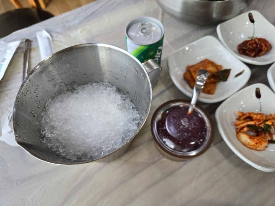 얼음은 시원하게 먹기 위해 그릇에 적당히 넣고 사이다 반만 넣어 줘서 잘 섞어주기. 맛보고 간이 부족하다 싶음 고추장 더 넣음 된다.
