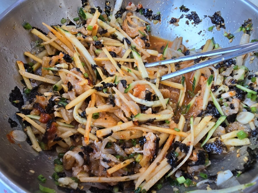 사이다나 얼음 안 넣구 밥을 넣으면 회비빔밥이 되고, 물회로 먹으려면 사이다랑 얼음 팍팍 넣기! 전통 물회라서 육수가 따로 없는데, 그래도 엄청 맛있다. 일단 회가 양이 엄청 맛고 너무 고소하고 쫄깃하니 맛나다. 그리고 고소한 참기름인지 깨향이 좋고, 양념도 너무 맛있음.