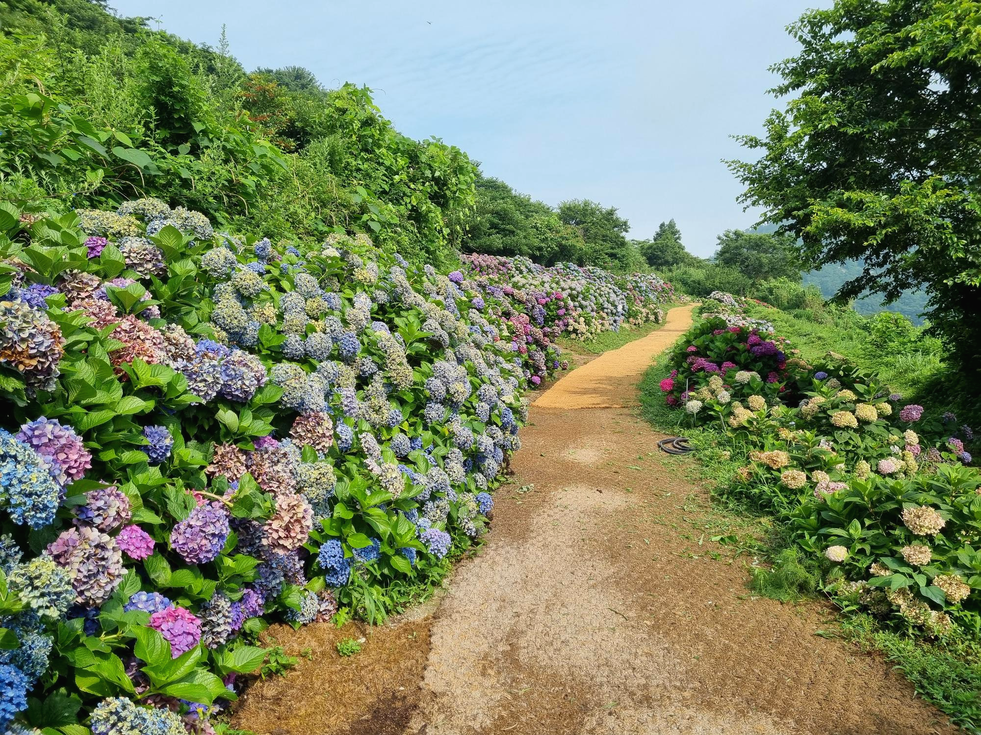 만개 시기가 지나서 시든 수국들도 있었지만 전체적으로 보면 아직까지는 흐드러지게 수국 꽃들이 많이 피어 있었다. 특히 송글송글 동그란 꽃잎 모양으로 피어난 팝콘 수국꽃은 한창 피고 있는 시기 같았다. 잘 닦인 길을 따라서 수국 꽃들이 가득한 담벼락이 쭉 이어져 있었다. 풍성하게 핀 수국들을 보며 길을 걸었다. 왼쪽으로는 수국 꽃들이 가득하고 오른쪽으로는 바다가 내려다 보이니 눈이 아주 즐거웠다.