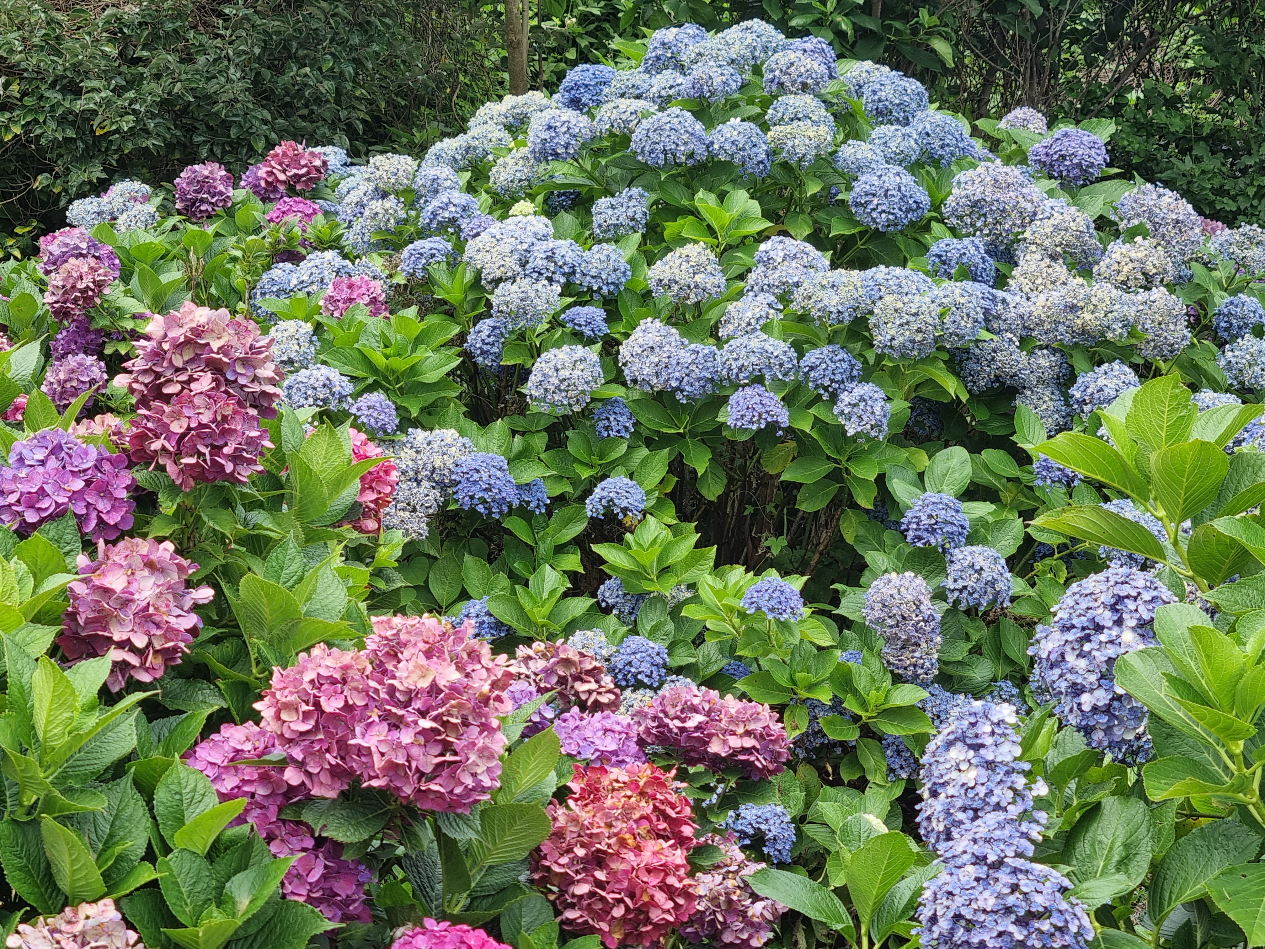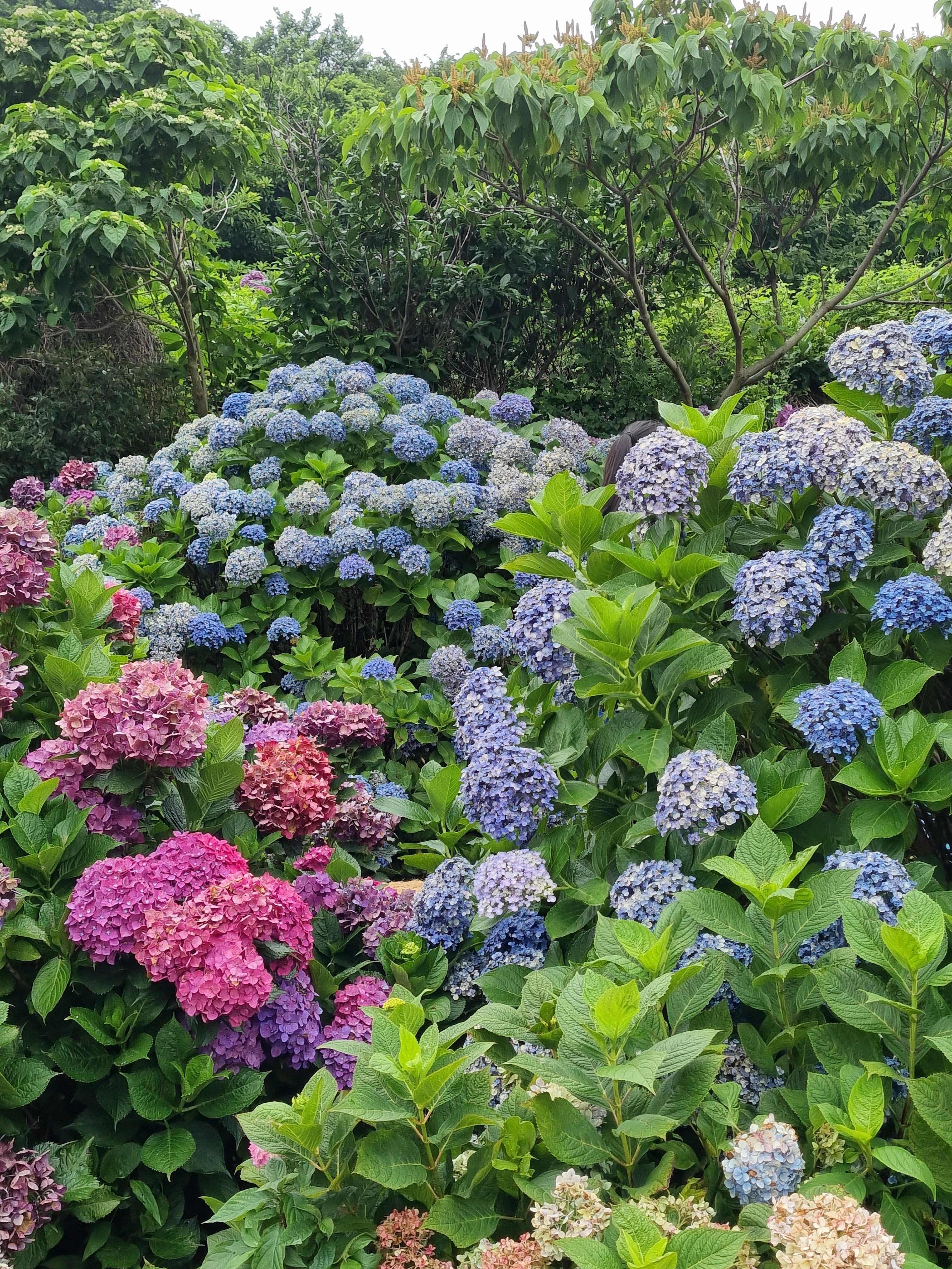 난 어릴 때부터 수국이 참 좋았다. 작은 꽃잎들이 여러개 모여 둥그렇게 피어난 모습이 풍성하고 아름다웠다. 그리고 내가 제일 좋아하는 색인 파란색이라서 좋았다. 파란색 꽃은 그리 흔하지 않아서 더 귀하게 느껴졌다. 그러다가 분홍색과 파란색이 뒤섞인 묘한 빛깔의 수국을 보게 되었다. 그 때 알게 되었다. 수국 꽃은 토양이 산성인지 알칼리성인지에 따라서 색깔이 바뀐다는 것을. 이렇게 여름마다 수국 꽃을 찾아다니는 것은 나에게 큰 기쁨이다.