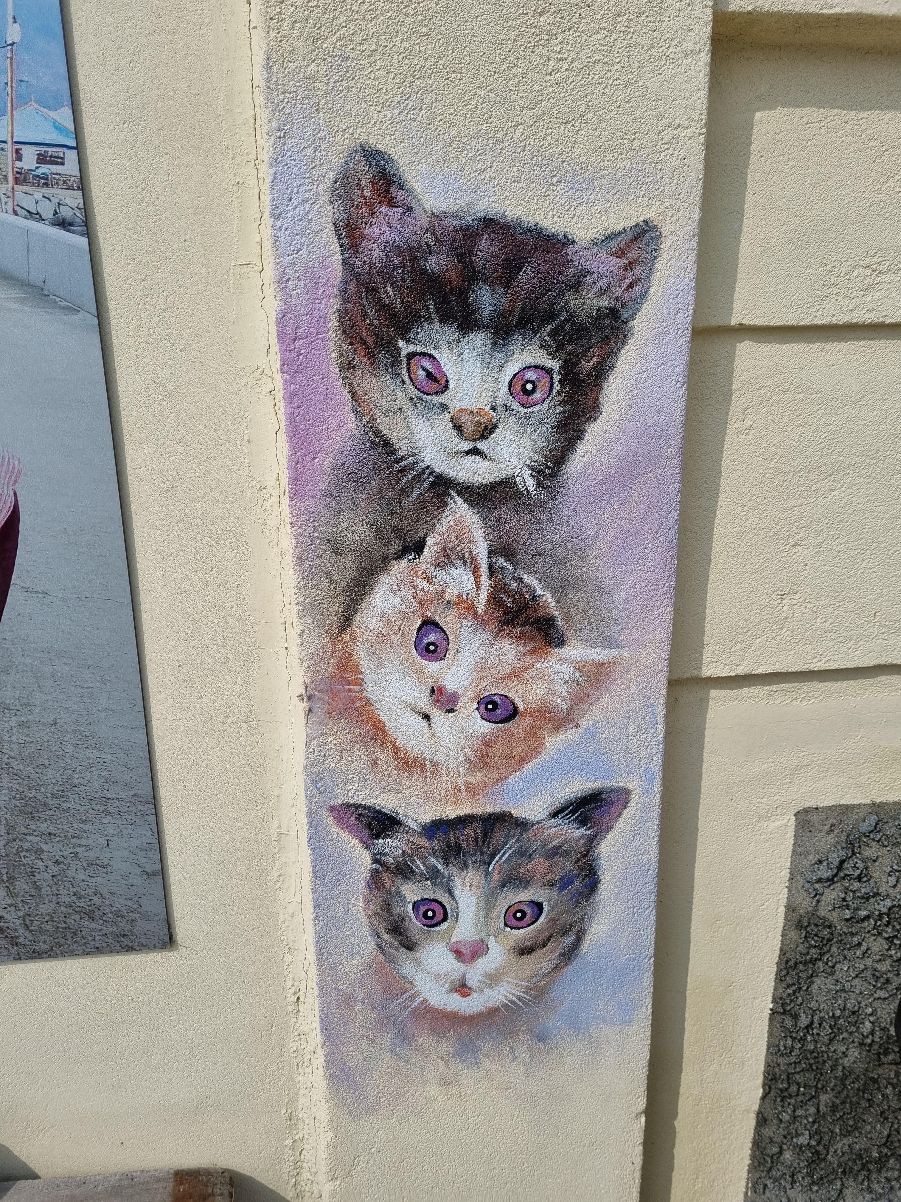 쑥섬에 들어서면 고양이와 관련된 것들이 많이 보인다. 괜히 고양이 섬이라고 불리는 것이 아니다. 왓냐옹- 하며 우릴 반겨주는 고양이 조형물, 아기자기한 고양이 벽화, 고양이 할머니 집 그리고 진짜 고양이들! 쑥섬으로 들어오는 표를 구입하면 팜플렛을 하나씩 주는데 팜플렛 아래에 1,000원 쿠폰이 하나씩 붙어 있다. 이 쿠폰을 가지고 할머니 집 앞에서 고양이 간식을 하나 사서 고양이에게 줄 수도 있다. 고양이를 좋아한다면 맛있는 간식을 챙겨오는 것도 좋을 것 같다. 본래 쑥섬에 고양이가 많이 살고 있었는데 동물 보호 단체와 연이 닿으면서, 주민들과 보호 단체가 함께 고양이를 돌보고 있다고 한다. 길을 걸어 다니다 보면 귀여운 고양이들을 자주 볼 수 있다.