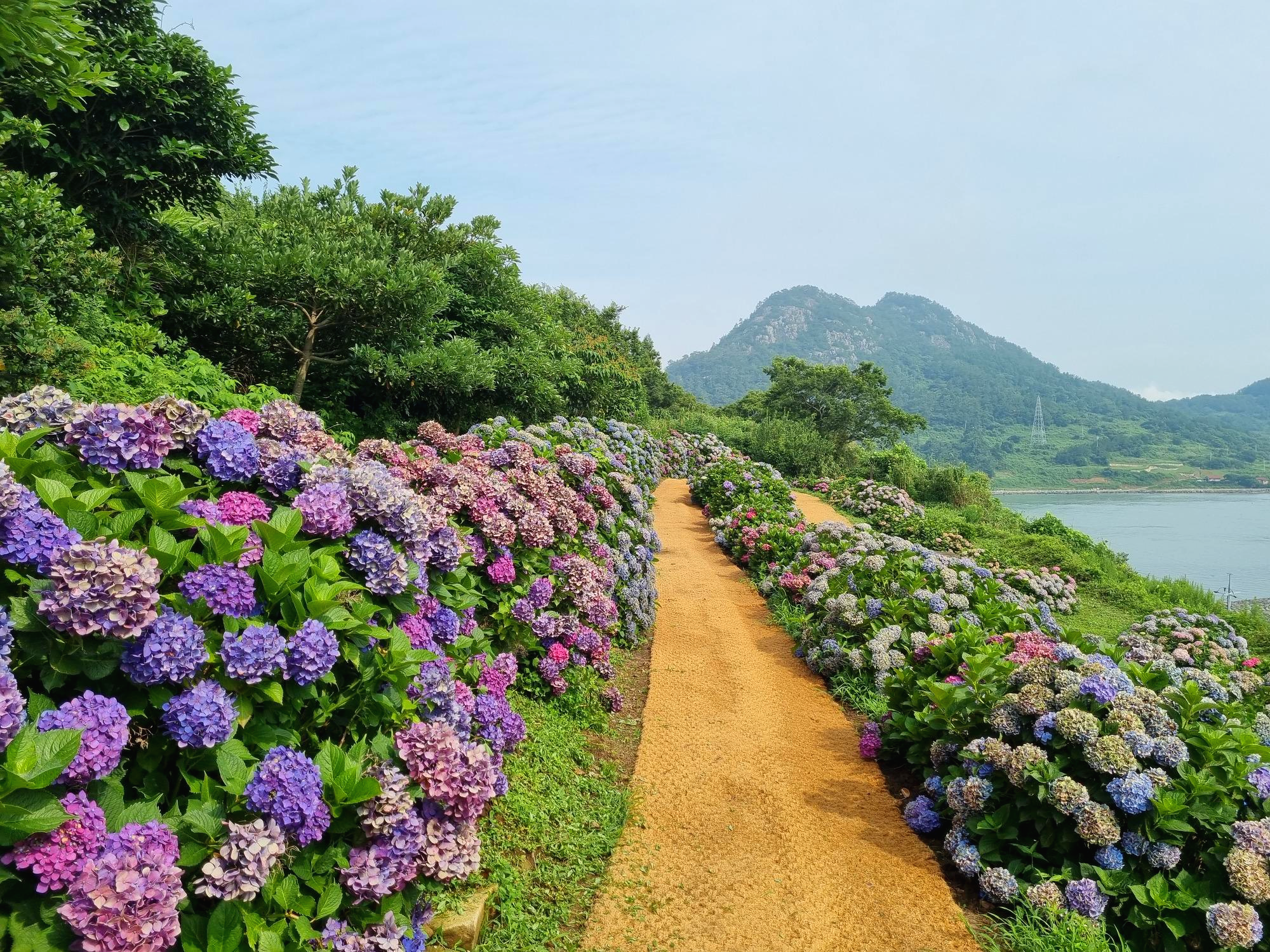 무더운 여름이지많 쑥섬에 와야하는 이유는 아름다운 수국 때문이다. 만개 시기는 약간 지났지만 아직까지도 수국들이 남아있을 것 같아 쑥섬을 찾았다. 봄에 찾았을 때 몽글몽글 봉우리진 수국 꽃들을 봤었다. 여름에 수국 보러 가야지 생각만 하고 있다가 드디어 쑥섬을 찾아왔다.