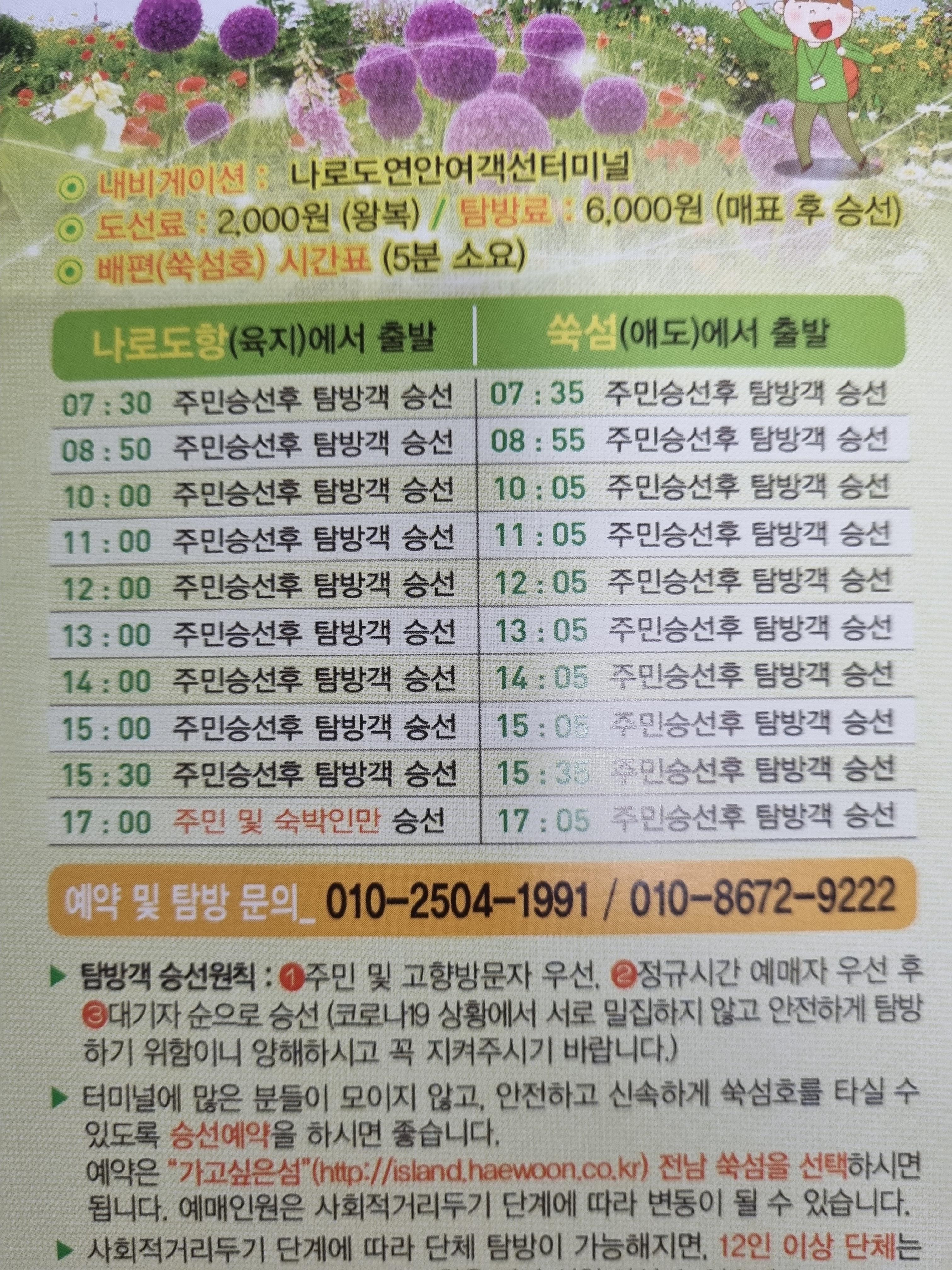 쑥섬으로 가는 배편 시간표 나로도항에서 쑥섬으로 가는 배는 아주 작다. 조그만 배에는 최대 12명만 탑승할 수 있었다. 어느 봄날 주말 오후 쯤에 왔었을 때는 사람들이 꽤 많았었다. 이번에는 주말이었지만 첫 배를 타고 들어가니 사람들이 별로 없었다. 배에 오르면 정말 눈 깜짝할 새 쑥섬에 도착한다. 배를 타기 전 우리에게 쑥섬에 대해 설명해 주시던 어르신은 쑥섬 가는 배가 우리나라에서 가장 안전한 배라고 하셨다. 정말 그 말이 맞는 것 같았다. 왠지 카누를 타고 가도 금방 도착할 것 같았다.
