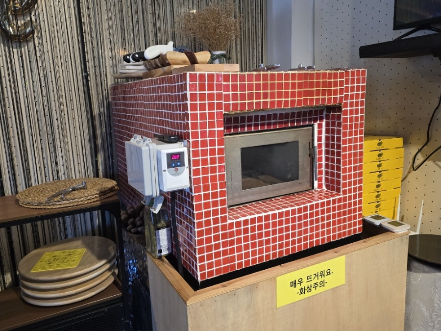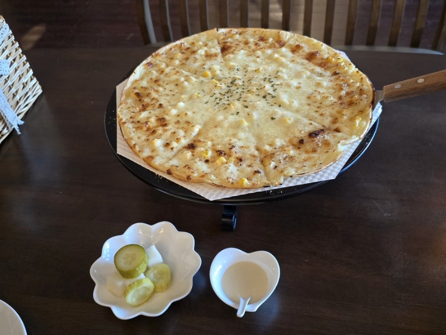 작은 오븐에 구워져 나오던 감자피자. 평창에서 나는 자연 치즈를 듬뿍 넣은 피자라고 하셨다. 직접 만든 수제 피클과 어니언 소스도 같이 내어 주셨다.
