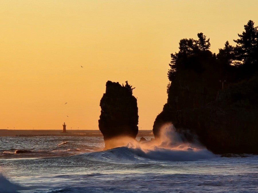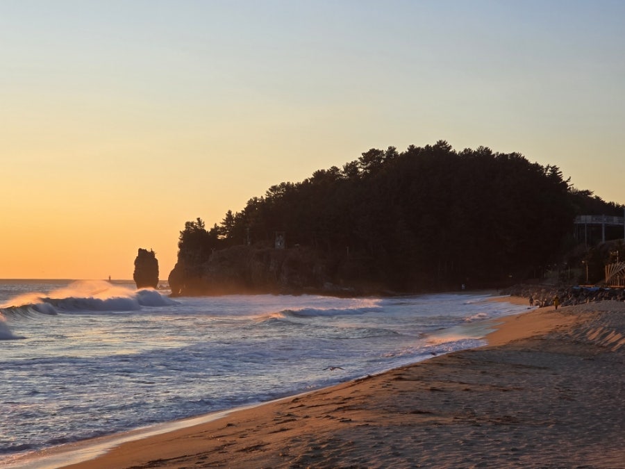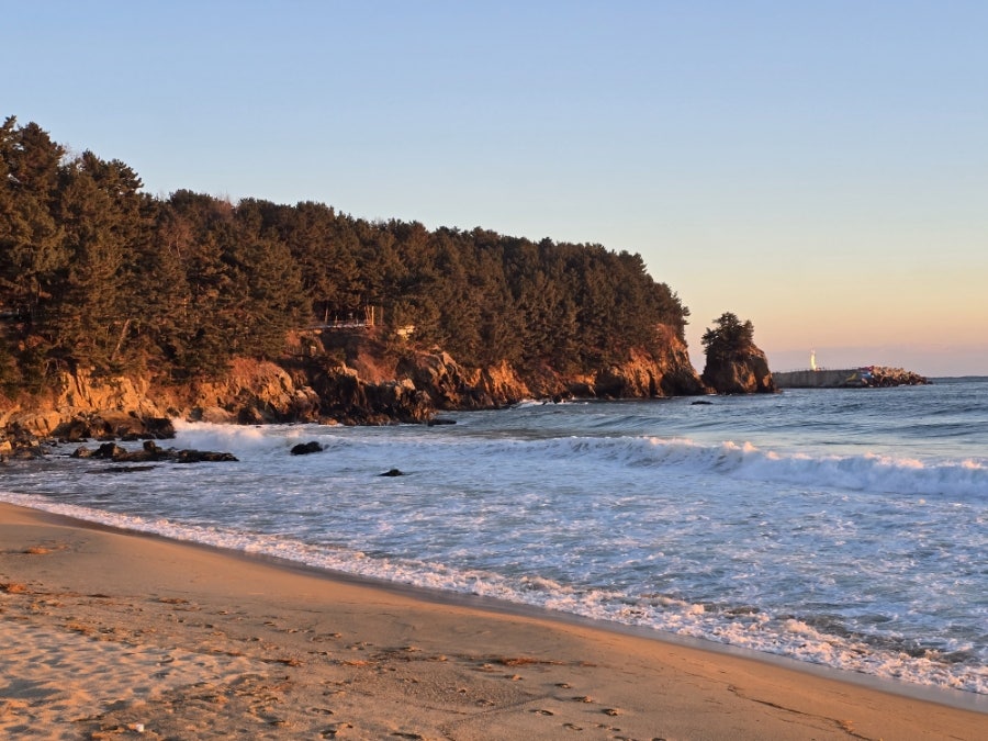 해수욕장의 오른편 끝으로는 바다 위로 우뚝 솟은 검은 암석이 하나 보였다. 그 암석에 끊임없이 파도가 쳐대면서 금빛 물방울들이 우수수수 부서졌다. 그 장면이 뭔가 신비로워 보여서 계속 쳐다봤던 기억이 난다.