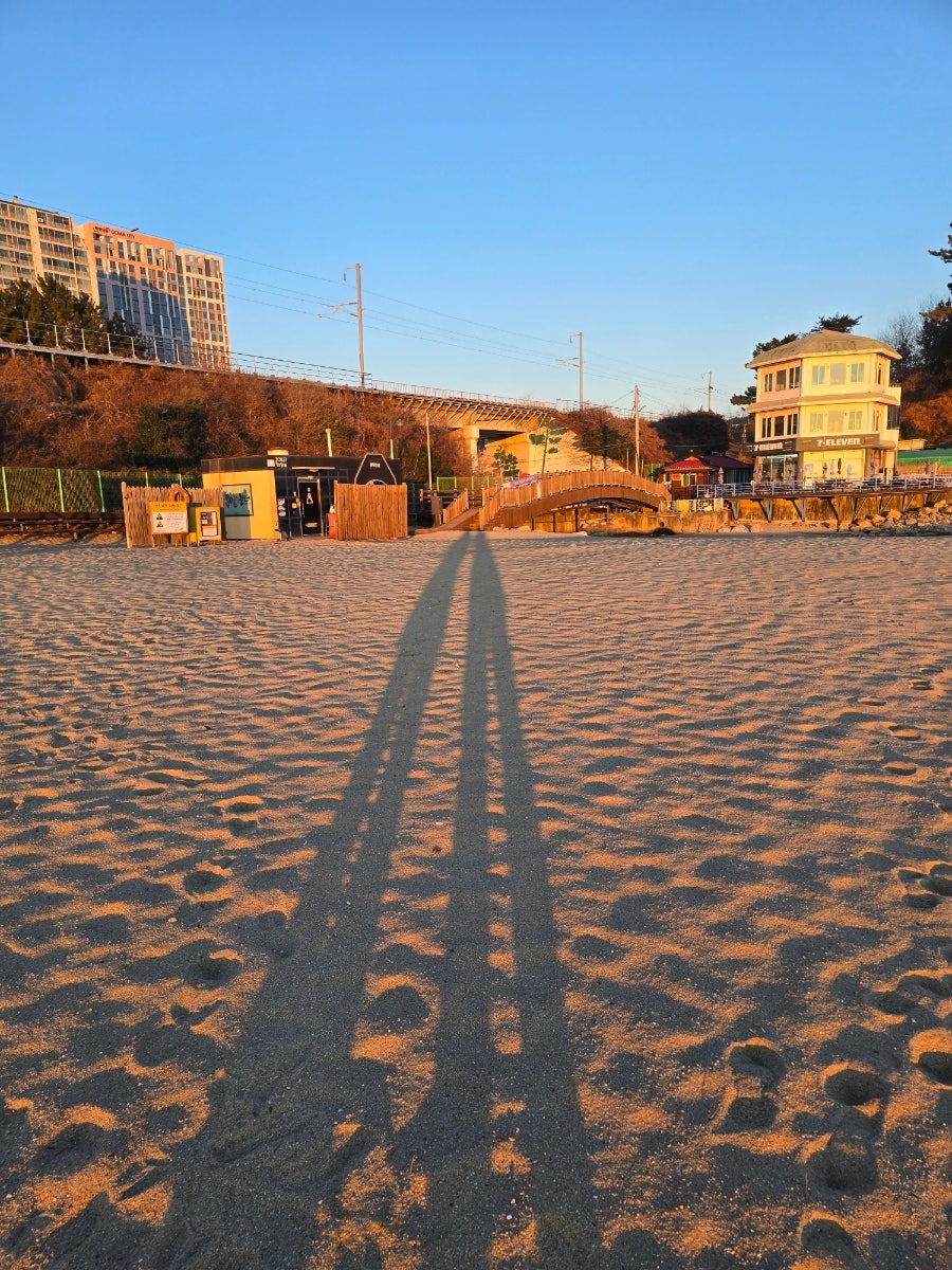 해가 다 떠오르고 모래가 온통 금빛으로 물들었다. 그리고 우리 둘의 그림자가 길게 해변 끝까지 늘어져 있었다. 날은 추웠지만 볕이 따스하게 느껴져서 마음은 포근했던 아침이었다. 한섬 해수욕장에서 멋진 해돋이를 보고 다시 호텔로 돌아가서 아직 못 다 채운 잠을 쿨쿨 잤다.반응형'우리나라 방방곡곡 > 강원도' 카테고리의 다른 글
