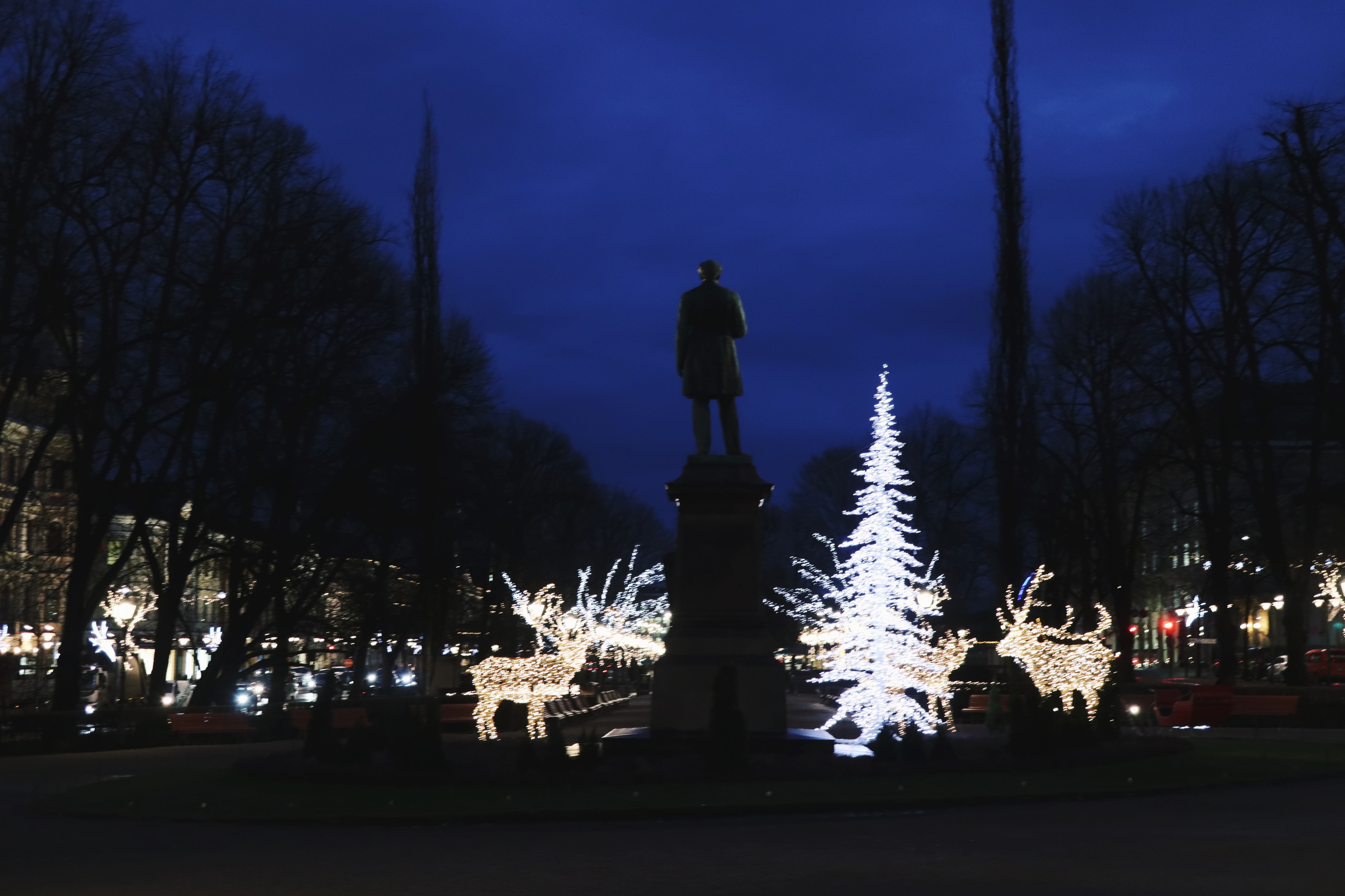 우리는 어제 낮에 지나왔던 에스플라나디 공원(Esplanadi Park)에 들어섰다. 시계를 보니 아침 8시를 갓 넘긴 시간이었다. 아직 빛이 내리기 전인 밤의 공원. 하얗게 반짝이는 트리와 노랗게 빛나는 순록들, 어둠 속에서 더 빛이 나는 겨울 풍경들은 낮보다 더 몽환적이었다.