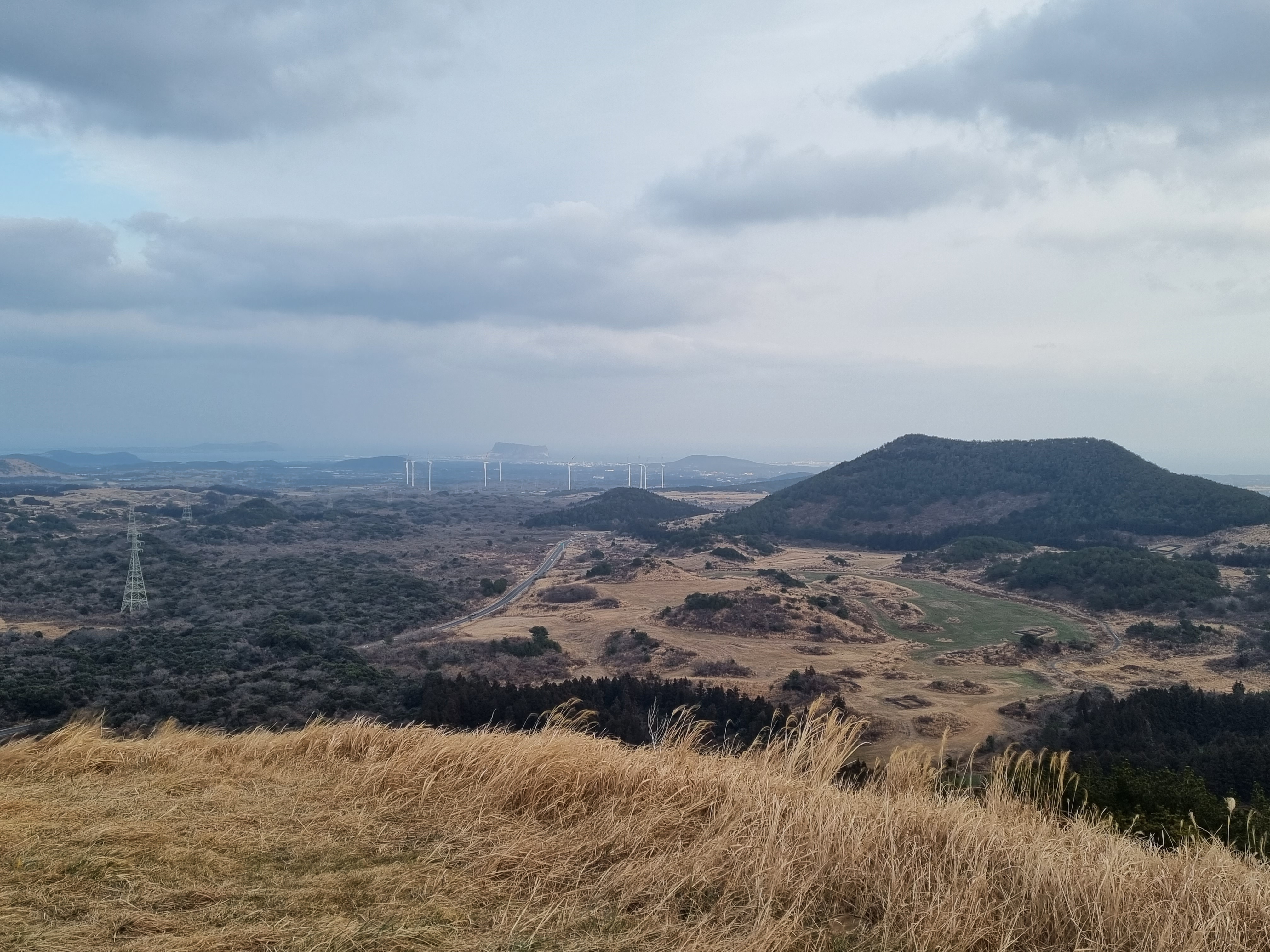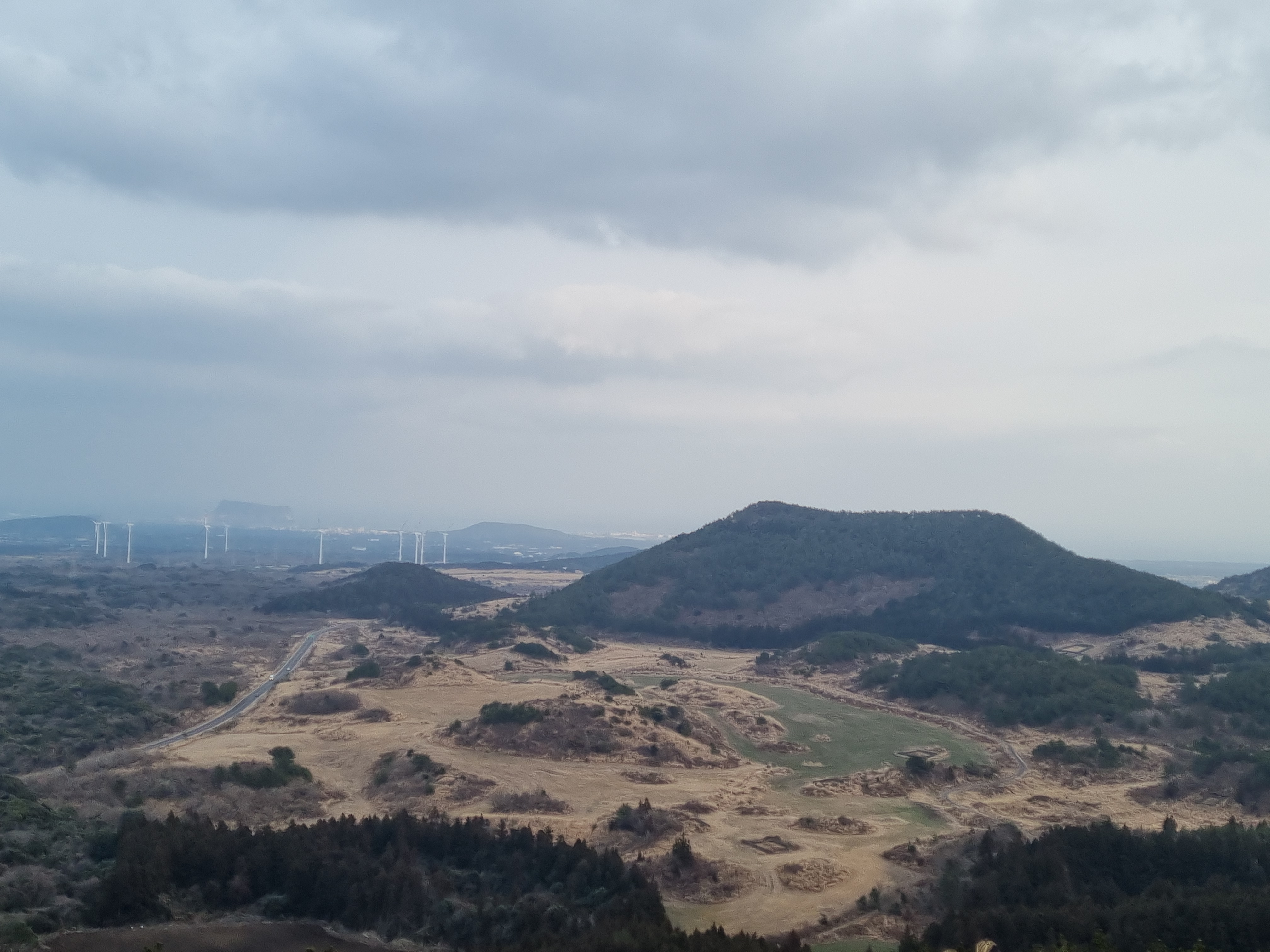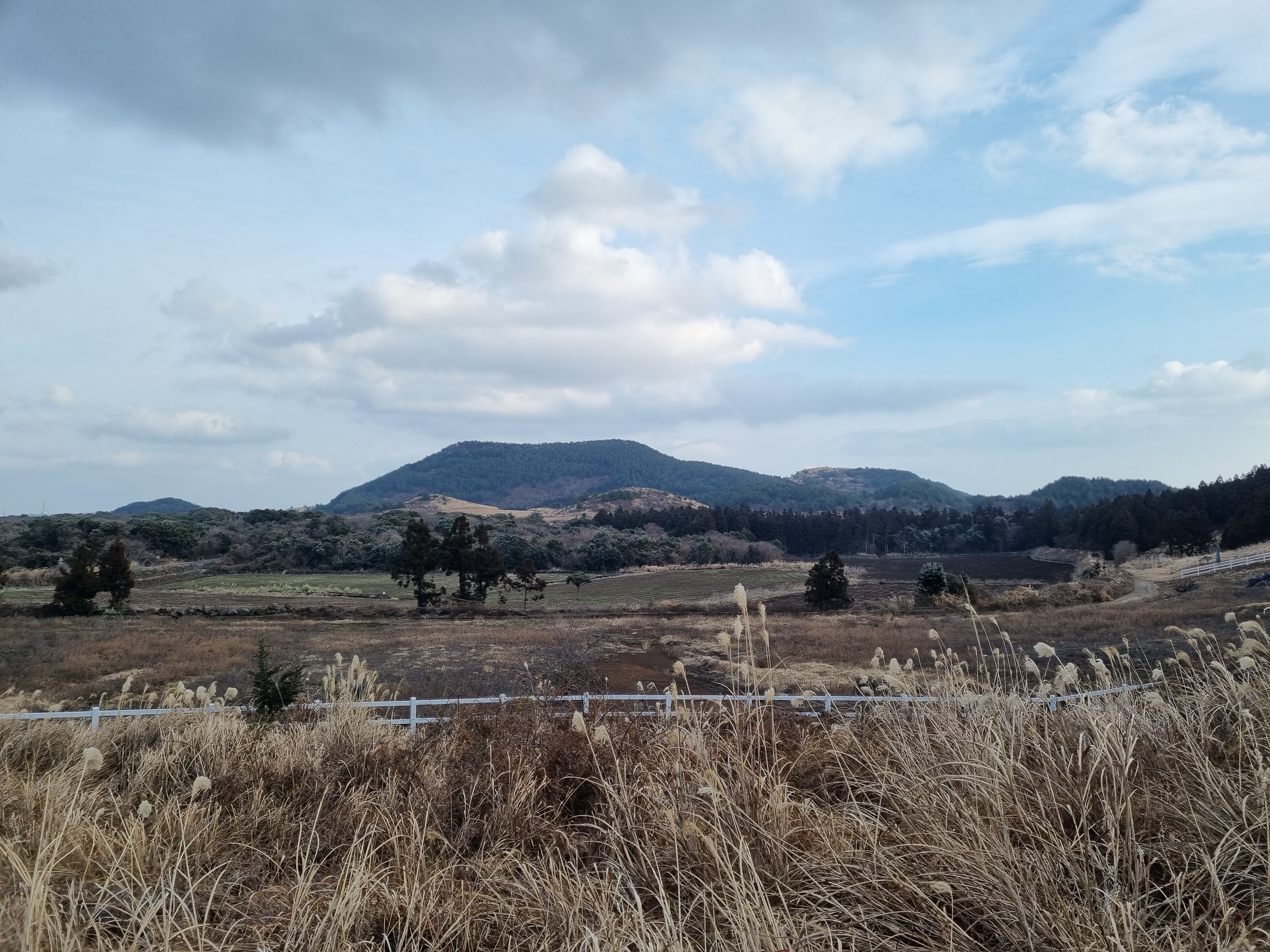 넓다란 들판 위에 군데 군데 솟아있는 오름들의 모습과