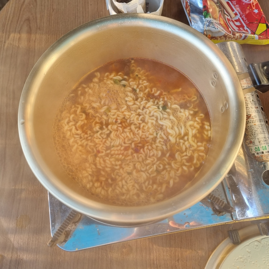 버너 위에 물을 끓이고 라면을 넣고 지글지글 끓여 맛나게 먹었다.