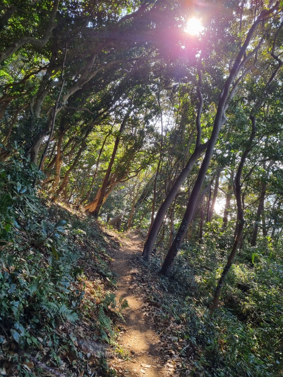 계속 내리막길을 따라 쭉 내려가다 보니 마침내 멀리 나무 사이로 바다가 보였다.