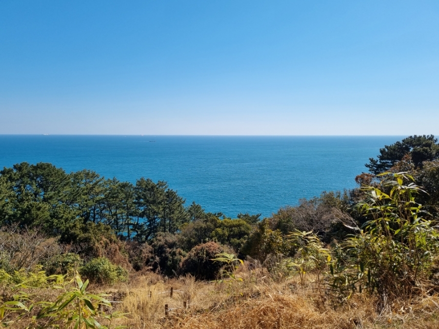 동백나무 우거진 숲길을 지나오니 와, 푸르른 바다가 보였다.