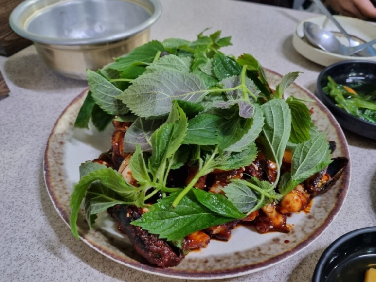깻잎이 수북하게 쌓인 돌문어 볶음.