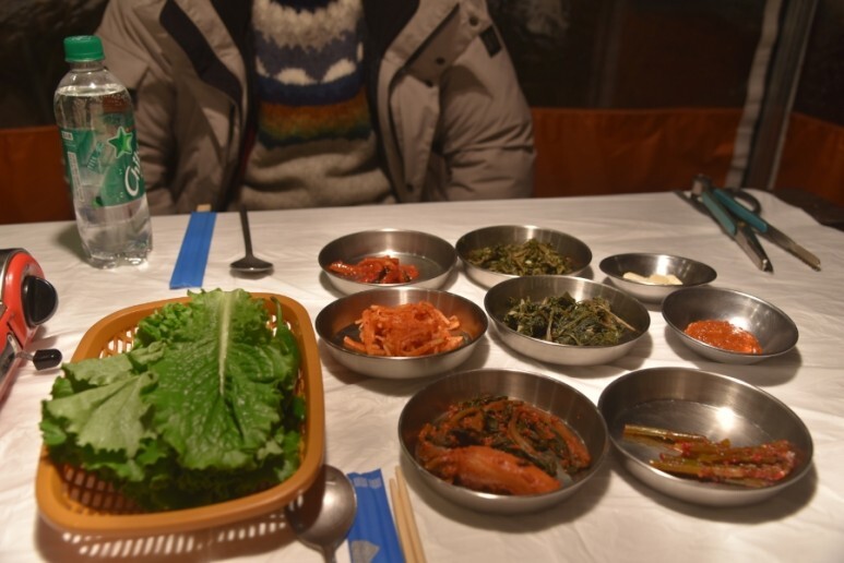 묵은지와 나물무침들 그리고 참나무에 구운 흑돼지 직화구이. 다 구워져 나오니 편했다.