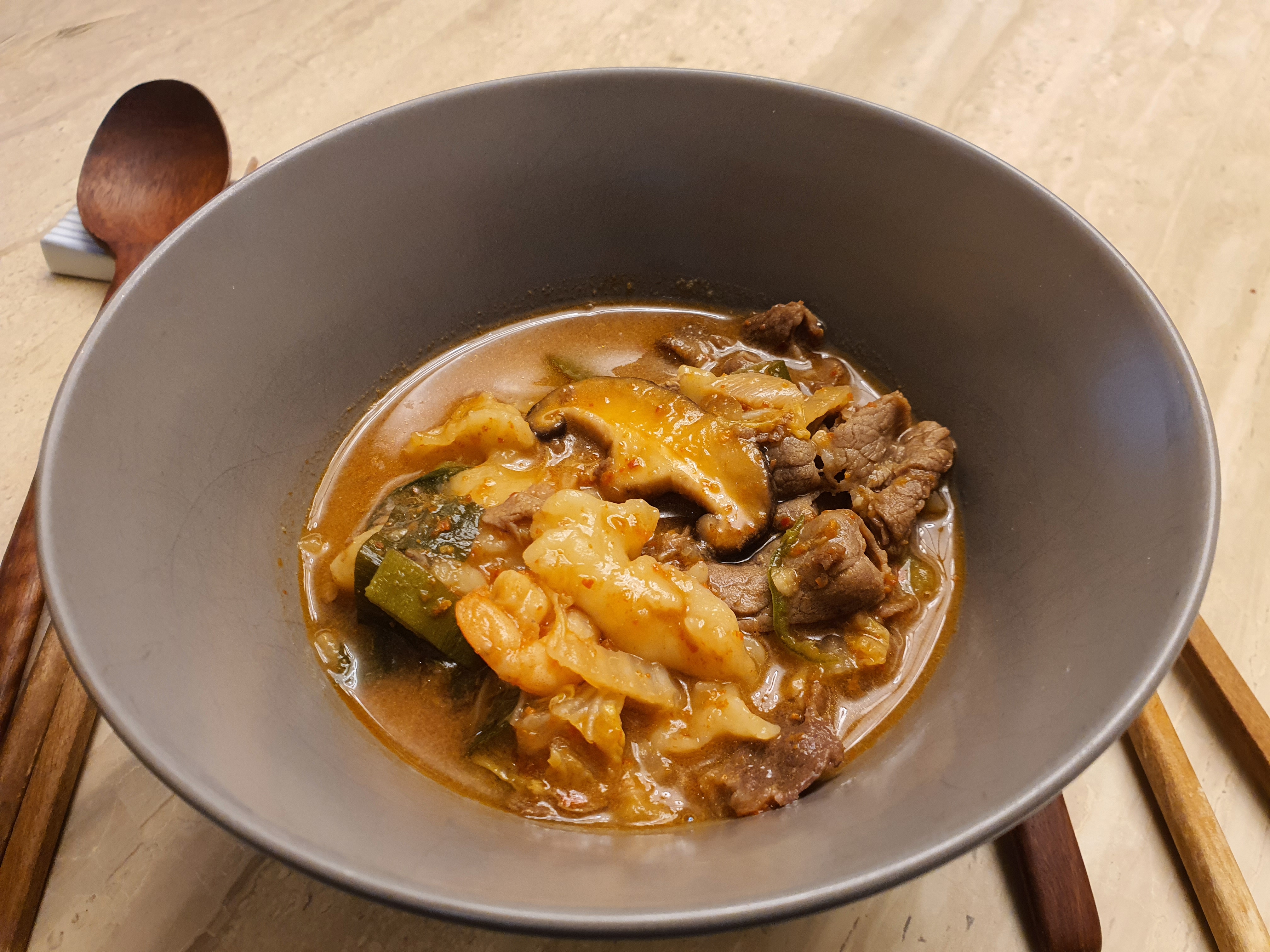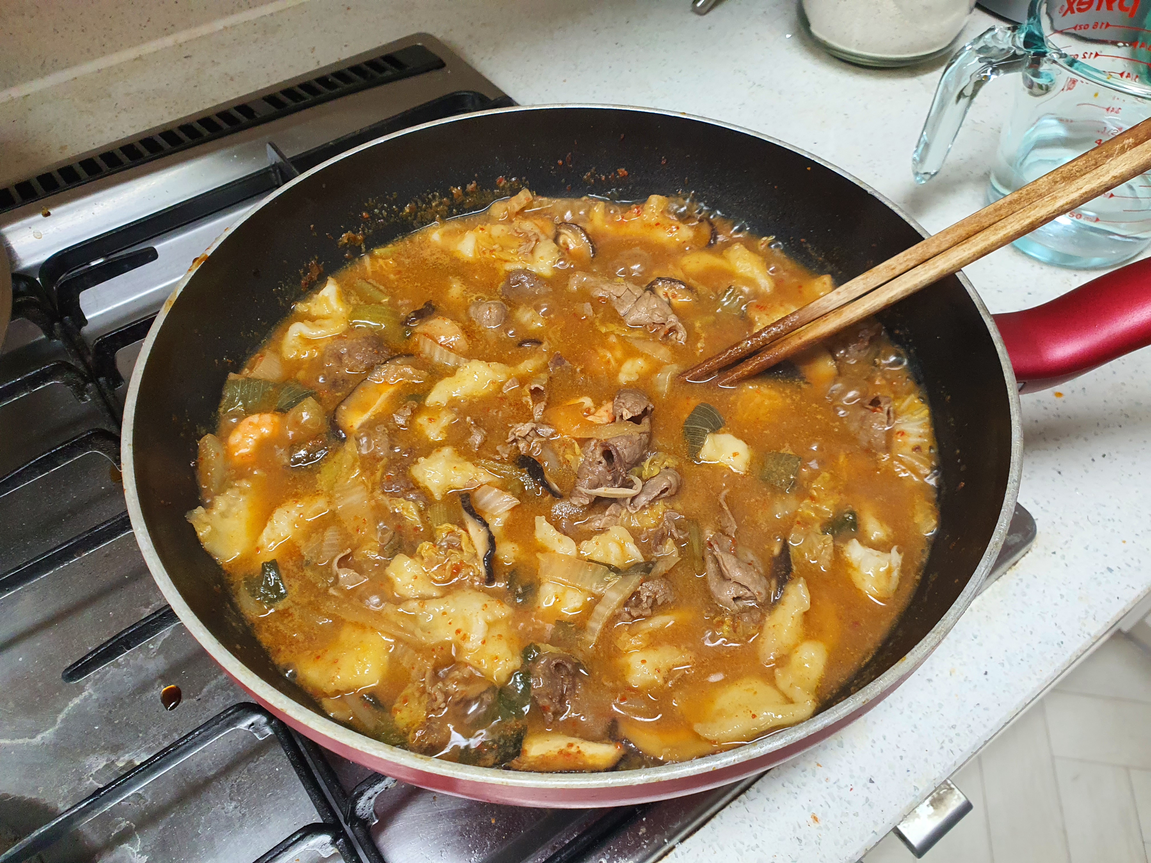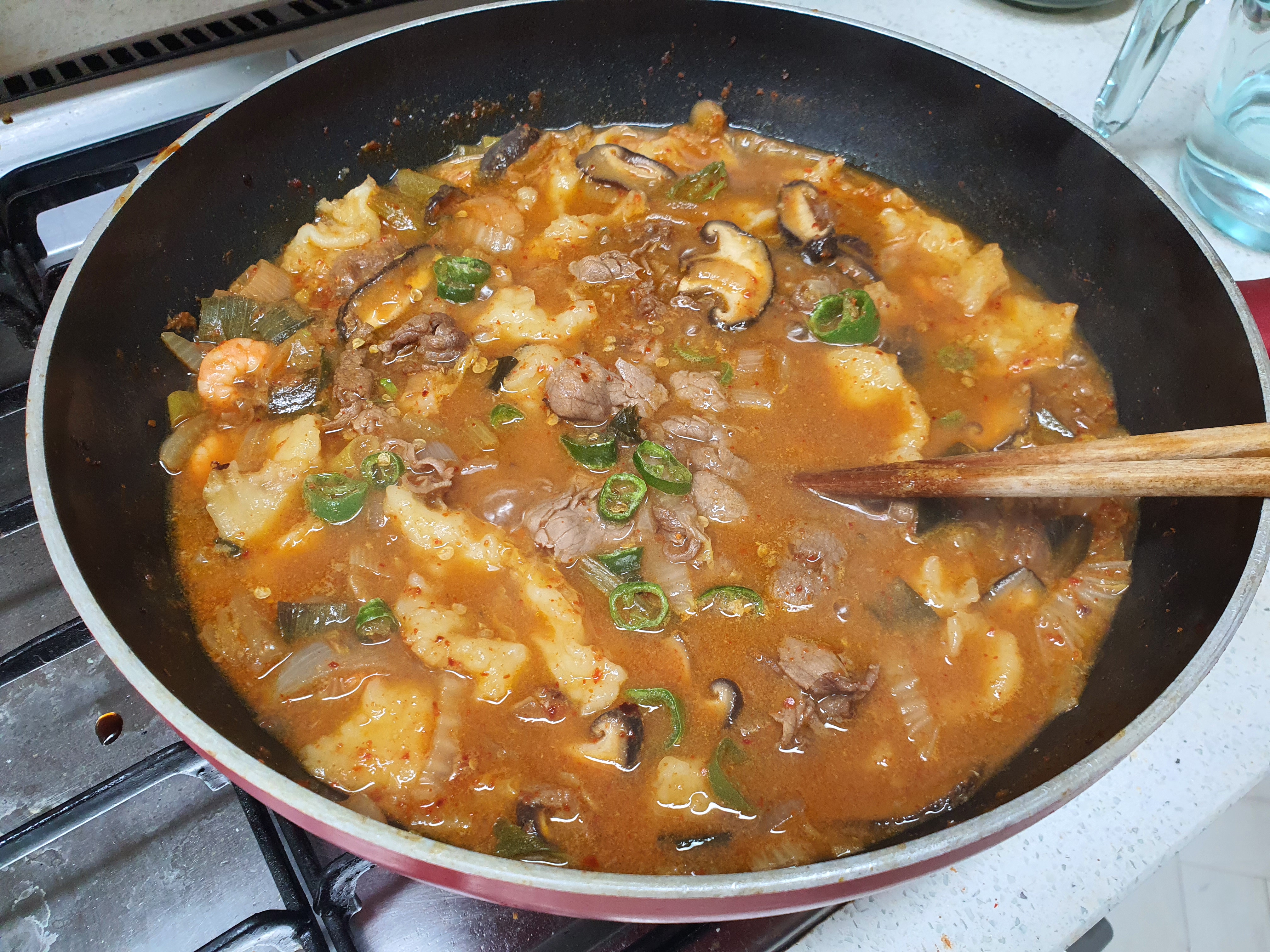 완성! 와이프는 수제비 귀신이라 수제비만 골라먹고 나는 고기랑 다른 재료만 엄청 먹었다. 남은 짬뽕국물과 건더기들은 냉장고 넣어뒀다가 다음날 점심으로 중화비빔밥처럼 밥이랑 볶아먹었다.