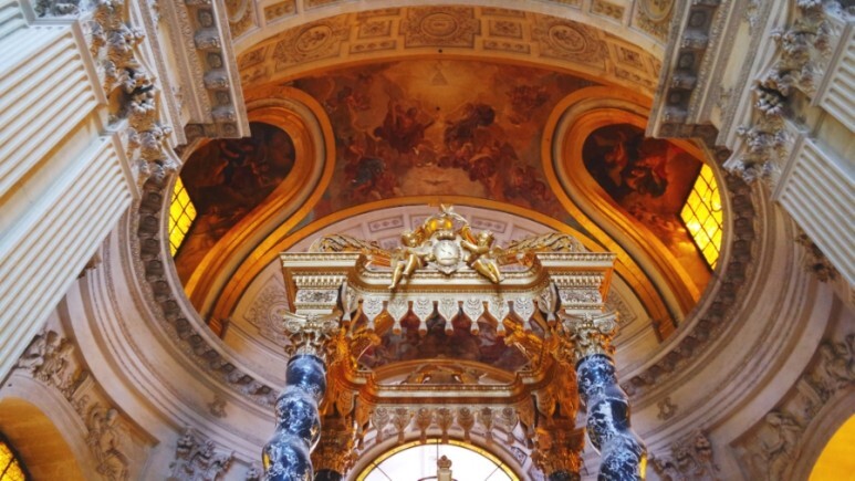 건물 곳곳이 아주 세밀하게 장식되어 있었다. 화려하고 다채로와서 눈을 돌리는 족족 즐거웠다. 베르사유 궁전 공사에 참여했던 이들이 앵발리드 공사에 많이 투입되었다고 하니, 베르사유 궁전을 보지 못한 아쉬움을 이렇게라도 달래봐야하나 그런 생각이 들었다. 번쩍거리는 금과 조각들과 하얀 기둥, 구경할 거리들이 많아서 바라보고만 있어도 황홀했다.