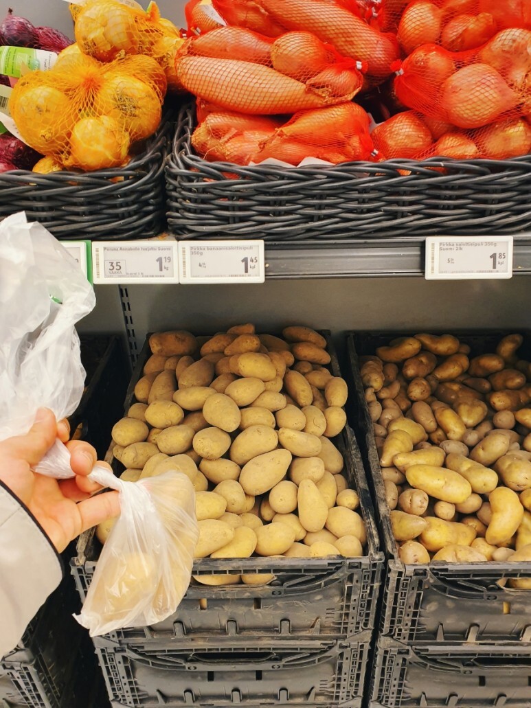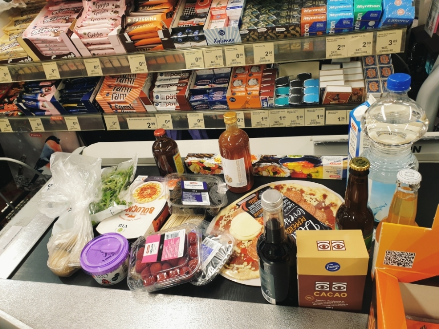 집에서 먹을 각종 과일쨈들과 다양한 티를 카트 안에 담았다. 그리고 뱅쇼와 비슷한 와인을 끓여 만든 핀란드 전통 음료인 글로기(Glogi)도 숙소 안에서 먹을 요량으로 몇 병 담았다. 벽난로 안에 넣어 구워먹을 생각으로 생감자도 몇 알 담아 넣었다.