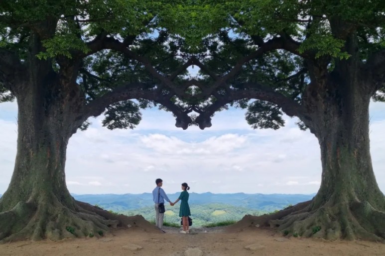 이곳까지 올라왔으니 성의 트레이드 마크인 사랑나무와 기념 사진을 꼭 남겨보자 싶었다. 정말 오른쪽 가지 모양을 보니 영락없는 하트 모양이었다. 나무 앞쪽에 포토존이 있어서 그곳에 서서 이쁜 기념사진을 남길 수 있었다. 그리고 완전한 하트 모양을 만드려면 찍은 사진을 조금은 변형해주어야 했다.