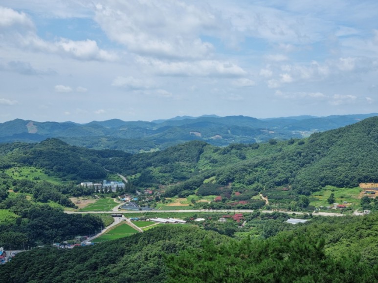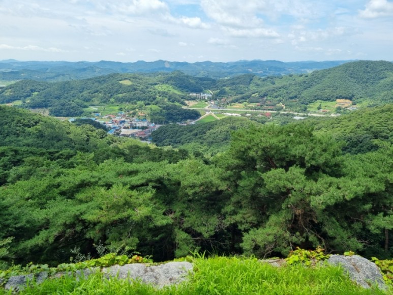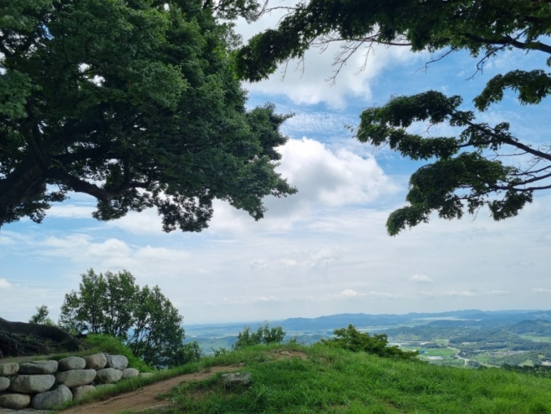 성곽 끝에 서서 내려다 본 모습이 아주 멋있었다. 하늘이 어찌나 높고 깊어 보이던지 가을 하늘 같았다. 그리고 그 하늘 아래 펼쳐진 초록빛 세상! 여름을 가득 머금은 세상이었다. 군데군데 핀 배롱나무 분홍 꽃들도 보이고 차들이 지나다니는 길과 구릉같은 작은 언덕들도 보였다. 미니어쳐 같이 보이는 작은 세상, 조금 있으면 우리가 저 세상 속으로 들어가겠지?