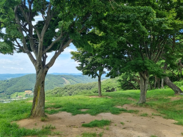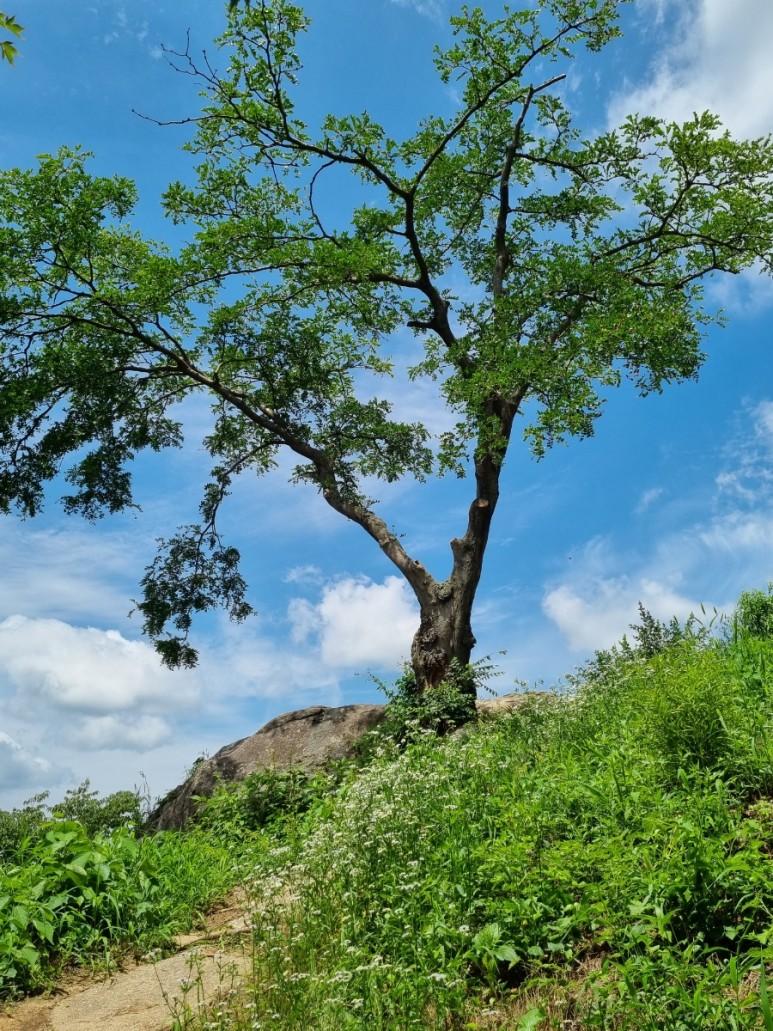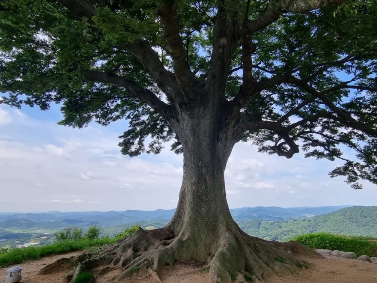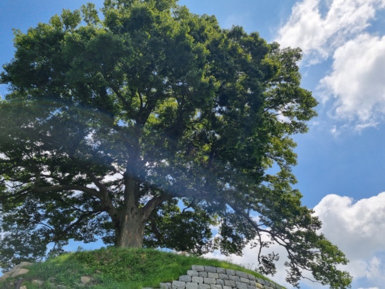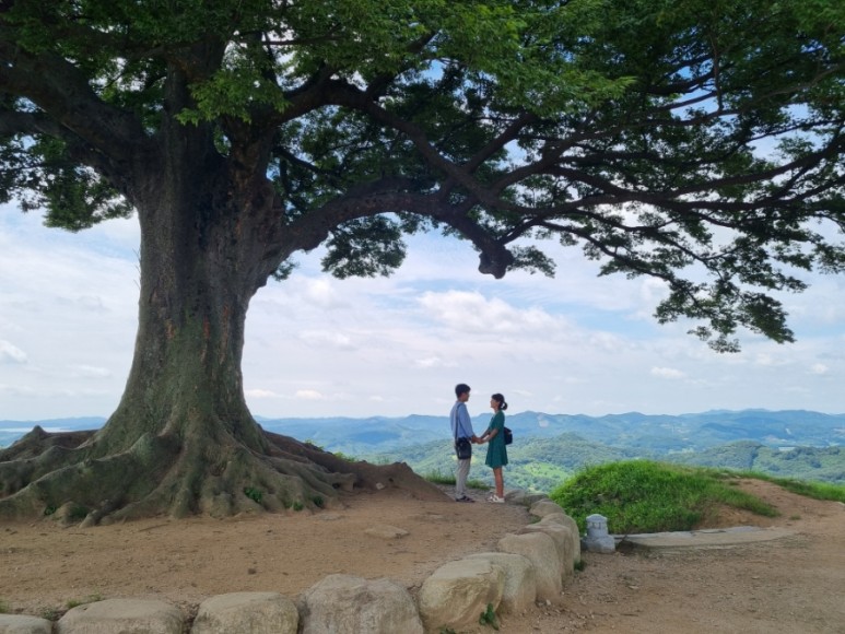 그런데 꼭대기에 거의 다다를 즈음에는 생각이 바뀐다. 고지에 오르니 무더운 더위로 씻겨 나가는 듯 했다. 바람이 솔솔 불어와서 가만히 나무 그늘 아래 서 있으면 시원했다. 땀방울들이 톡톡 떨어져 나가는 것 같았다. 계단에서 올려다 보이던 거대한 느티나무, 바로 저 나무가 성흥산성의 마스코트인 사랑나무이구나 싶었다. 수령이 족히 몇백년은 되어 보이는 커다란 나무였다.