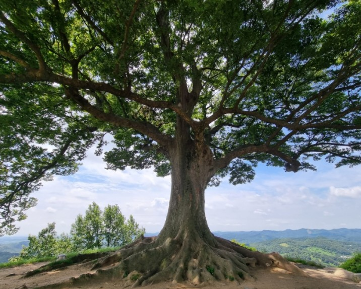 정면에서 바라본 성흥산성 사랑나무. 쭉쭉 시원하게 뻗은 가지가 아주 멋있었다. 둘레는 어찌나 크던지 옆에 서면 사람이 조그맣게 보일 정도였다. 흙바닥으로 뻗은 굵은 뿌리들을 보면 이 나무의 세월이 느껴졌다. 생생한 잎사귀들도 가지마다 가득했다. 온천지에 가득한 싱그러운 푸르름을 마음껏 볼 수 있으니 무더운 여름도 참을만은 하다 싶었다.