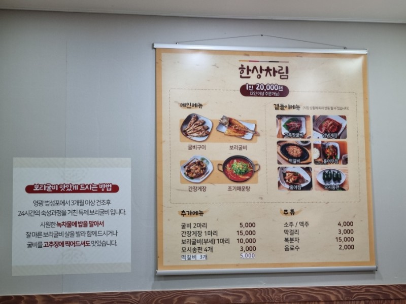 식당에서 주문 할 수 있는 메뉴는 단 한가지 뿐이었다. 바로 굴비정식! 1인 20,000원이었다. 이만원인데 정말 푸지게 나왔다. 보리굴비에 굴비구이, 간장게장, 조기 매운탕까지 메인 메뉴로 나오더라.