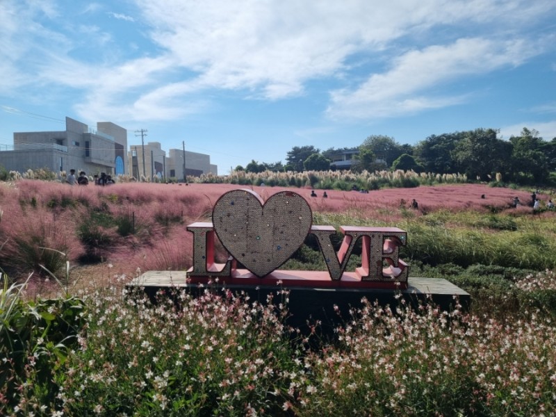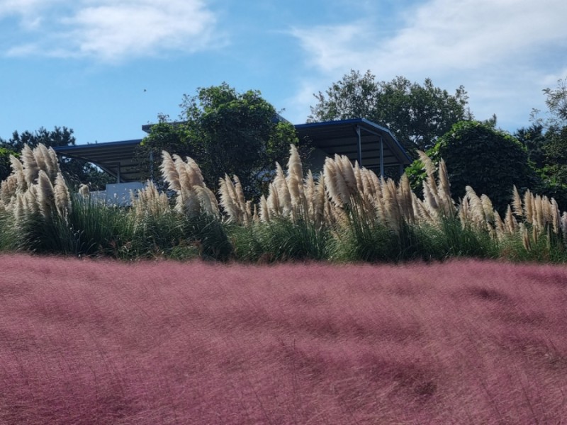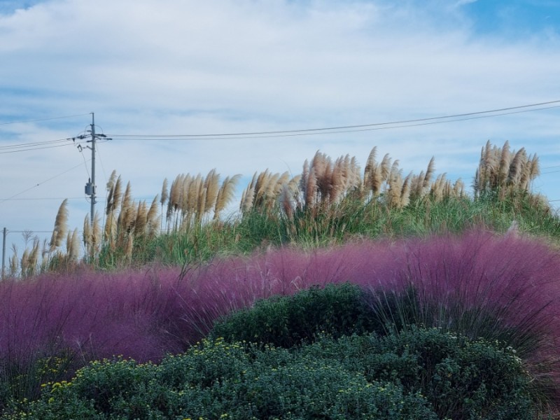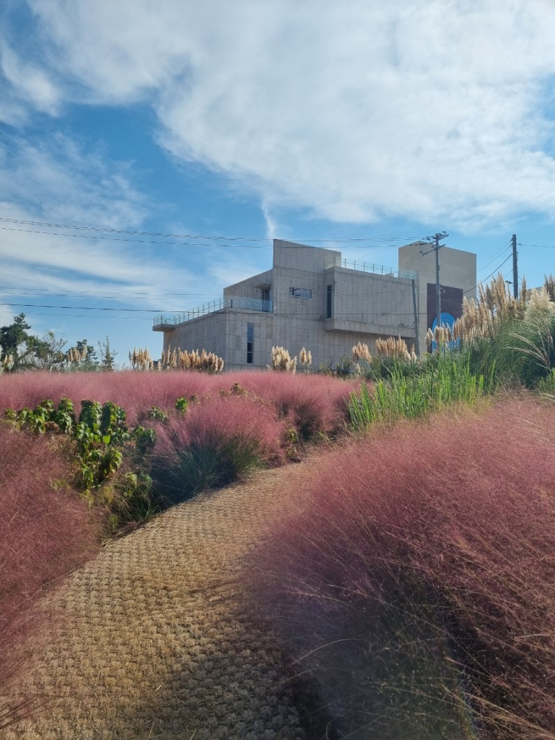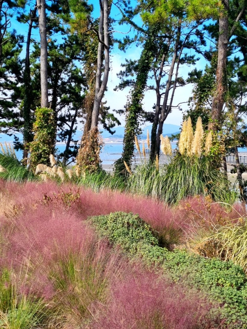바다가 내려다 보이는 언덕 위에 복실거리는 핑크뮬리들이 가득했다. 그리고 길쭉한 키의 팜파스들도 많이 심겨져 있었다. 핑크뮬리와 팜파스가 뒤섞여 한데 보이는 모습이 참 아름다웠다. 야자 매트가 깔린 길들을 따라 걸으며 아름다운 풍경들을 구경하며 사진을 찍었다.
