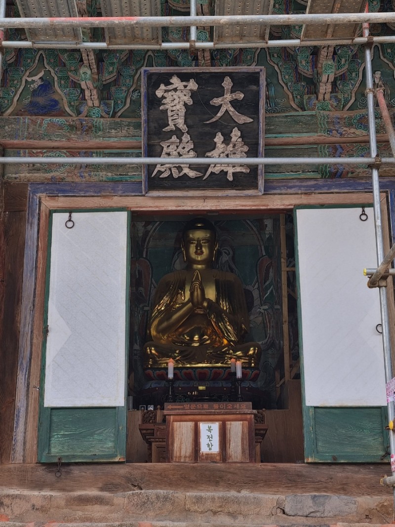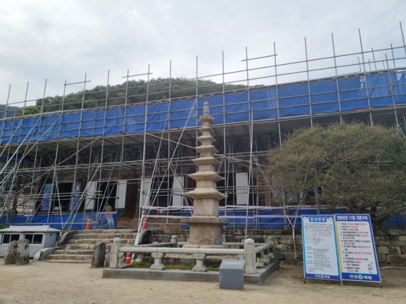 선운사의 대웅전은 아쉽게도 공사 중이었다. 지붕에 무슨 문제가 생겼는지 급하게 보수공사 중이라고 안내판에 적혀 있었다. 건물 전체에 비계가 세워져 있었다. 우리는 천천히 경내를 둘러 보았다.