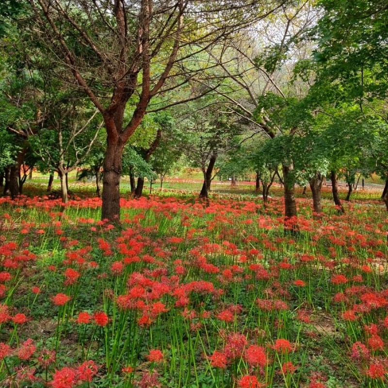 카페에서 목을 축이고 나와서 근처 꽃무릇 꽃밭을 구경했다. 이곳은 생태숲 보다 더 인기가 많은지 사람들로 북적였다. 흐드러지게 피어있는 꽃무릇 위로 커다란 은행나무들이 서 있었다. 가을날 노랗게 물든 모습이 무척 근사할 것 같았다. 은행나무 이파리 아래 따사로운 햇살을 머금은 꽃무릇들, 참 아름다운 풍경이었다.