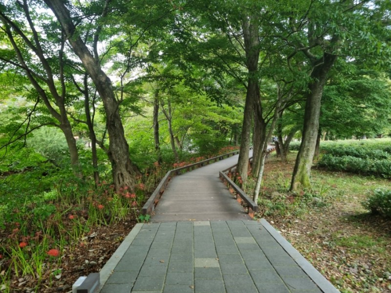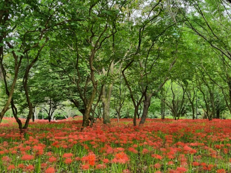 선운사를 찍고 가는 길에 선운산 생태숲이라는 곳이 나와서 차를 멈춰 세웠다. 선운사 근처에 인공적으로 조성된 공원 같았다. 아직 초록초록한 단풍 나무들 아래에 꽃무릇들이 피어 있었다. 생태숲에서 꽃들을 구경하며 선운사까지 걸어가보기로 했다.