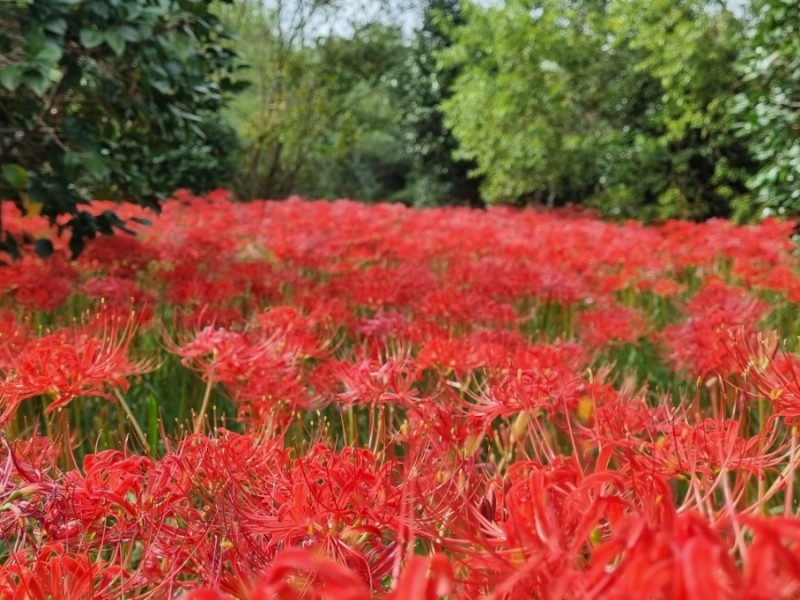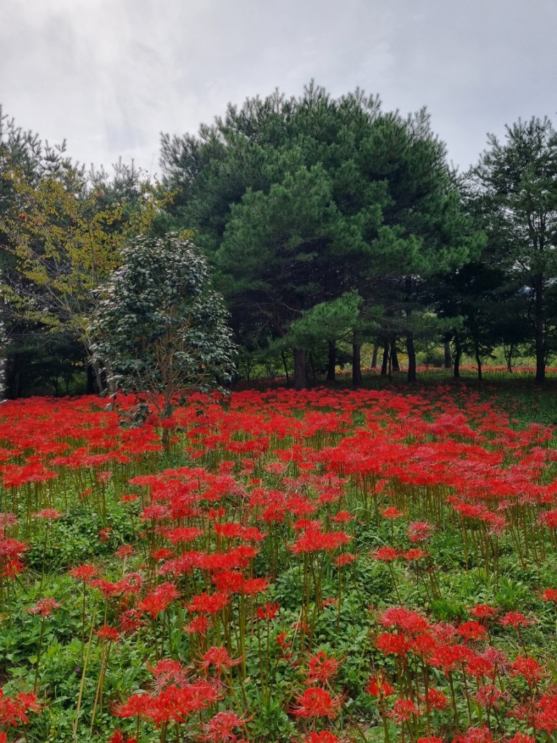 설렁설렁 선운산 생태숲을 걸었다. 숲에는 아직은 덜자란 듯한 조그만한 소나무, 동백나무, 단풍나무 등 다양한 나무들이 있었다. 그 아래로 수도 없이 많은 꽃무릇들이 피어나 있었다. 붉은 꽃망울을 활짝 터트린 꽃무릇, 흐드러지게 피어서 바람이다로 불면 붉은 물결이 넘실거리는 것 같았다.