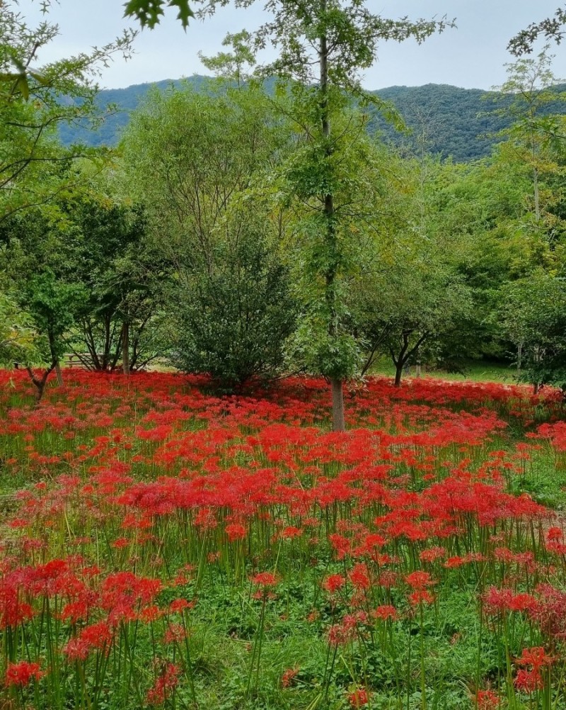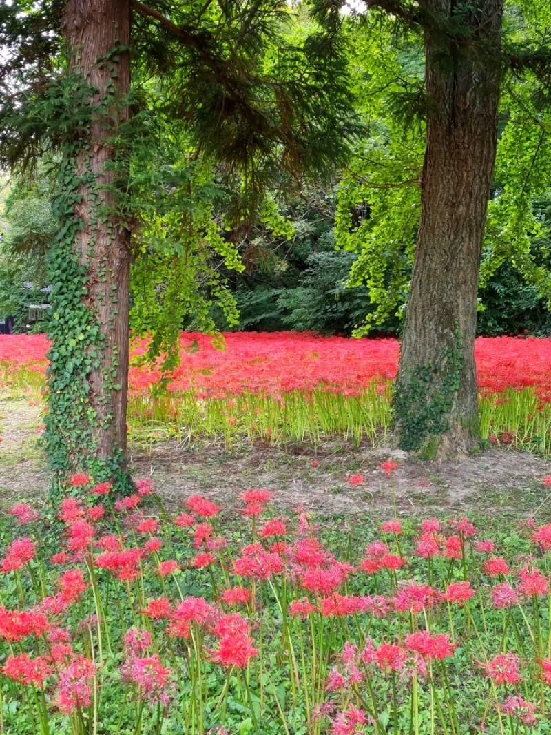 표를 끊고 안으로 들어오니 우와, 이곳도 꽃무릇 천지였다. 뭔가 더 정갈하고 가꾸어진 듯한 느낌의 꽃무릇 밭이였다. 커다란 은행 나무 아래 펼쳐져있던 꽃무릇 꽃밭은 무척 근사했다. 바로 앞에 카페가 하나 있어서 목을 축이고 가기로 했다.