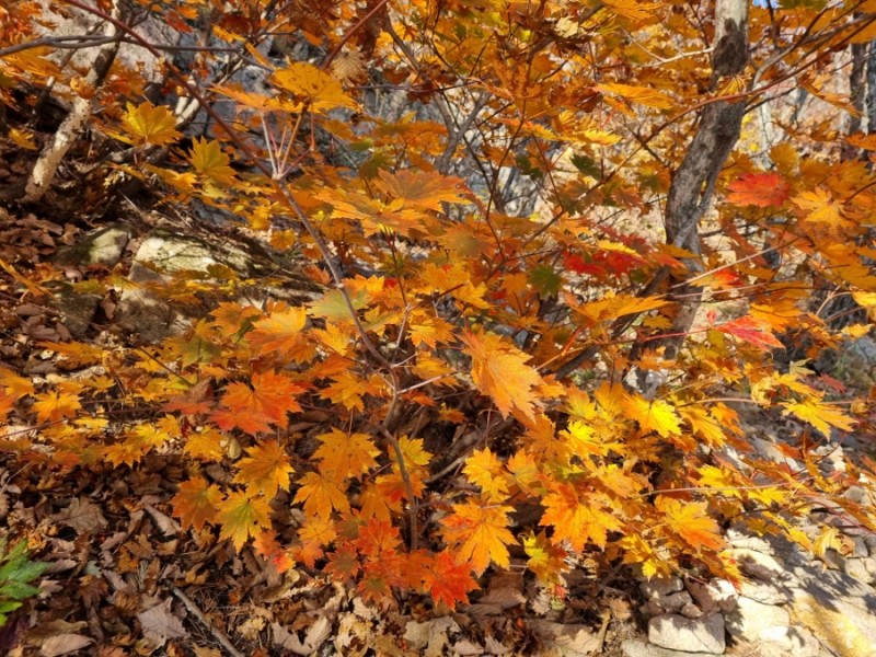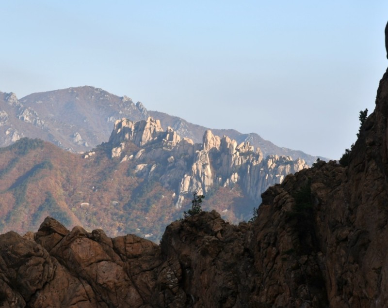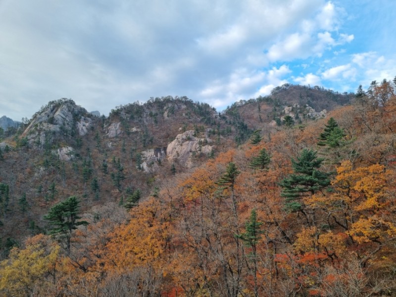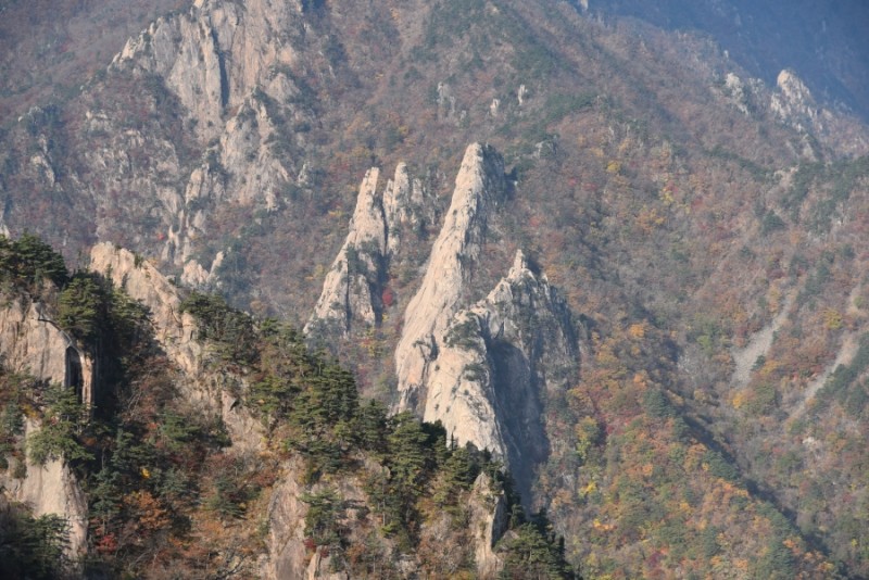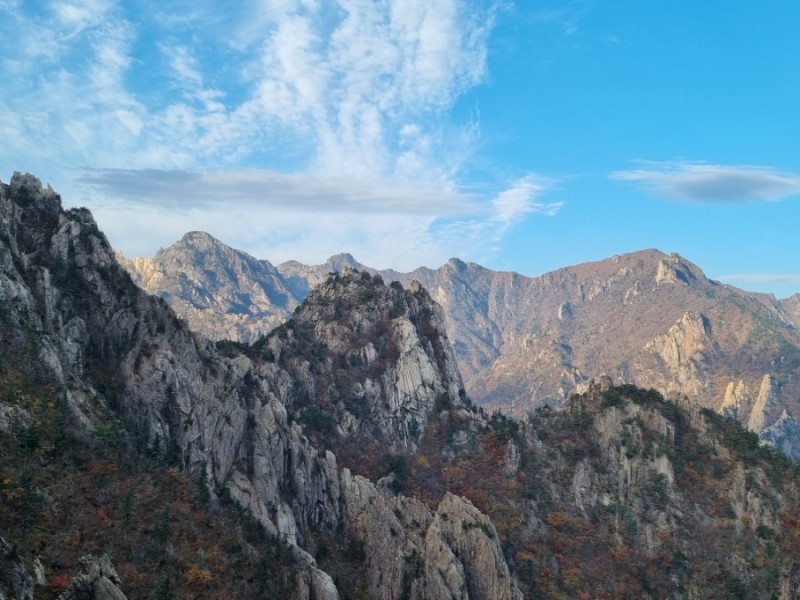 암벽 끝에 올라서니 만물상(萬物相)이 눈앞에 펼쳐졌다. 만가지 형상을 띈다는 이름답게 그 모습이 화려하고 다채로웠다. 수직으로 곧게 뻗어 하늘을 찌를 것 같은 암석들이 켜켜히 쌓여 있었다. 삐죽삐죽 솟아난 암석 사이사이로는 붉게 물든 단풍들이 제 모습을 뽐내고 있었다.