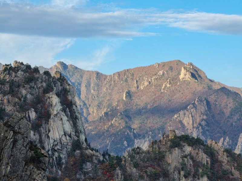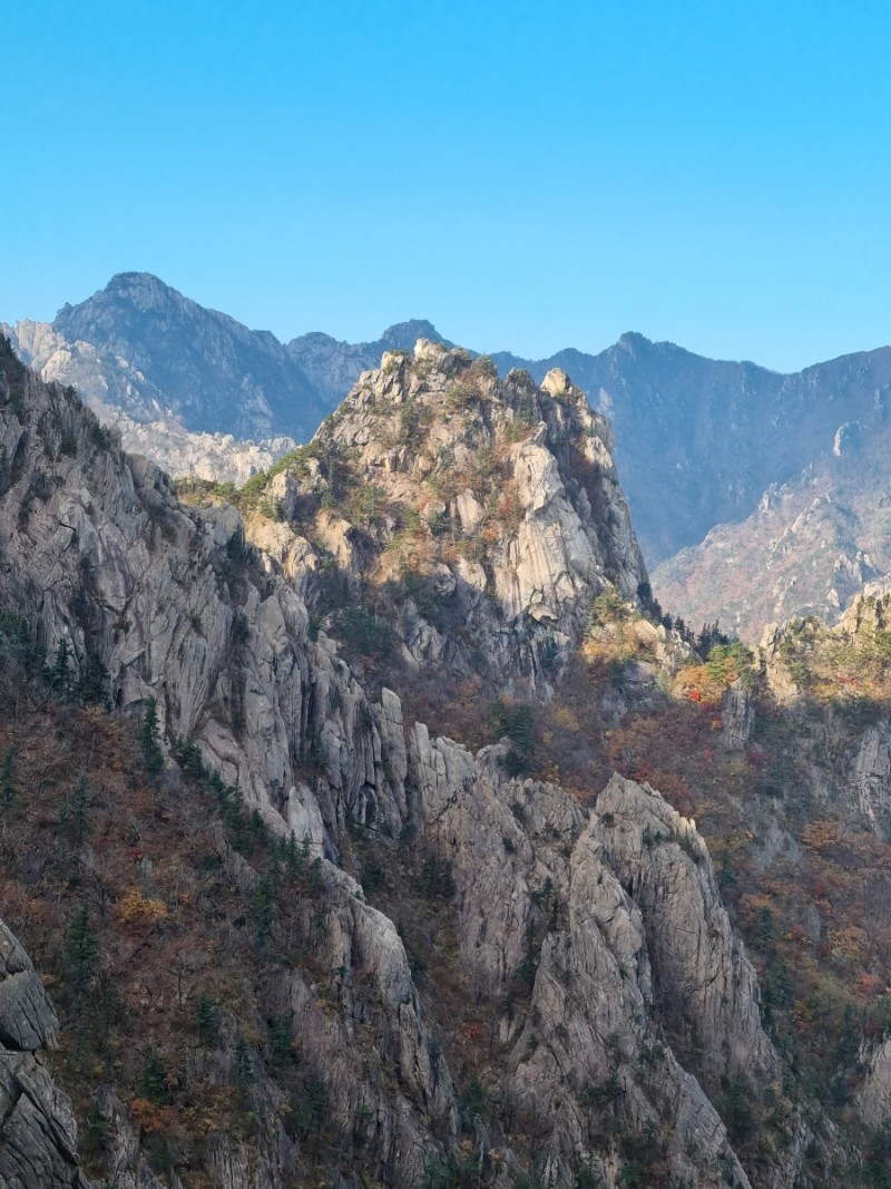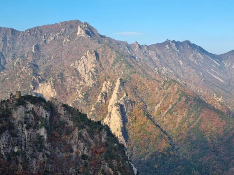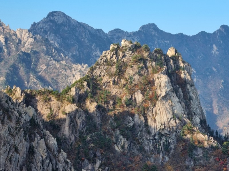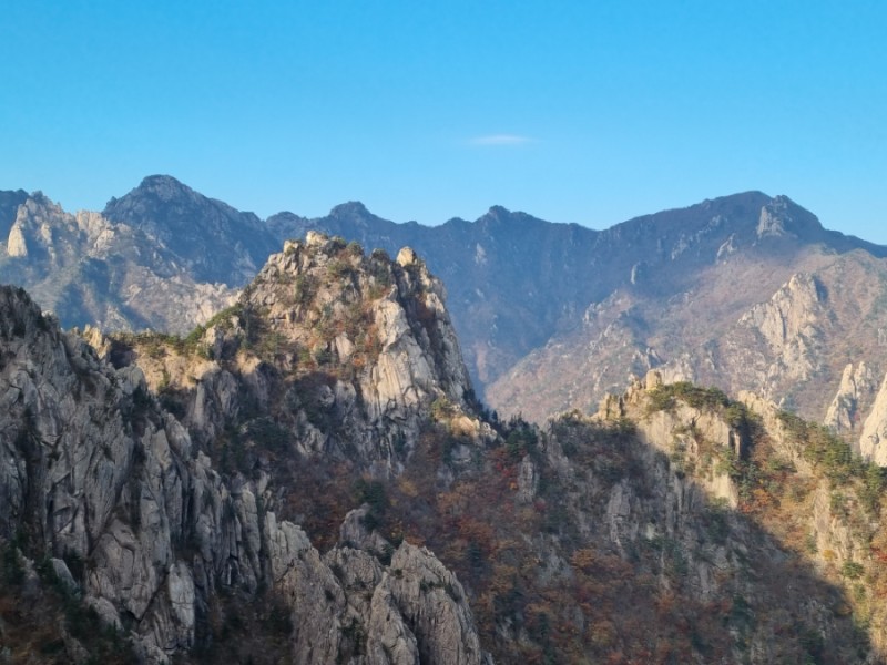 간식을 챙겨 먹고 배를 조금 채우고 자리를 털고 일어나 다시 설악산을 돌아 보았다. 우리가 간식을 먹는 사이 해가 하늘 위로 더 떠올랐는지 어두웠던 봉우리들에 훤한 빛이 스며들기 시작했다. 아침 햇살을 받으니 기암 사이에서 피어난 아름다운 단풍들이 더 돋보였다.