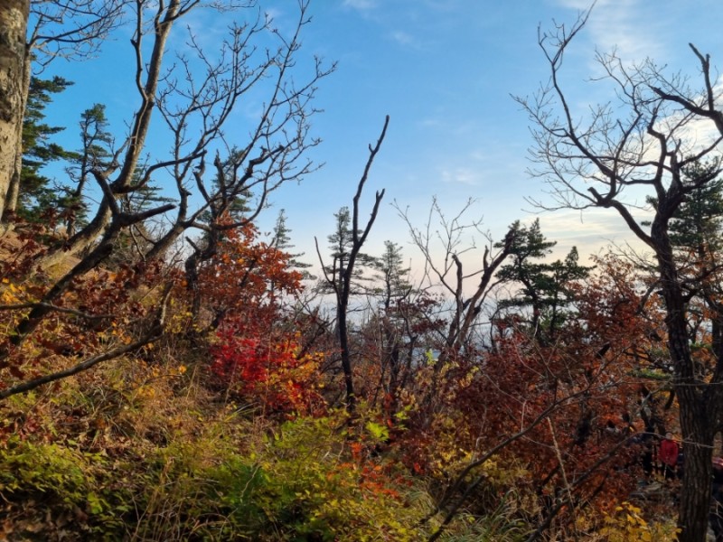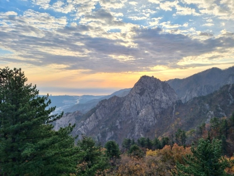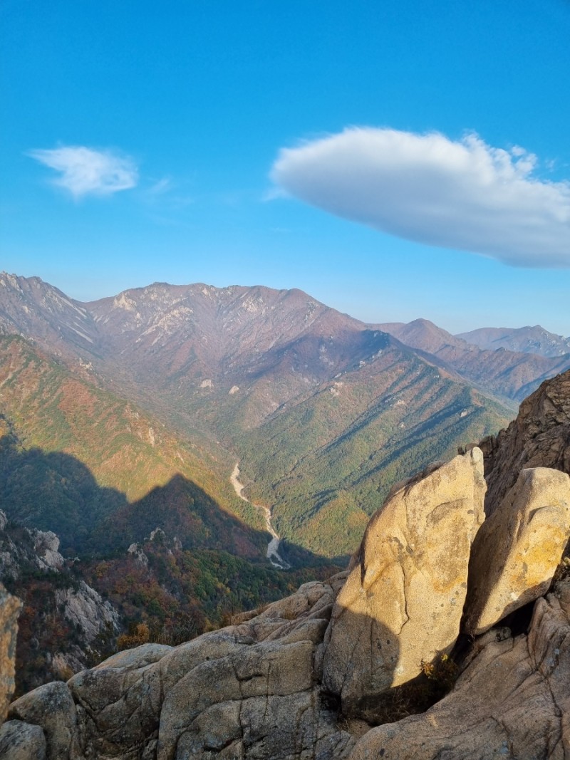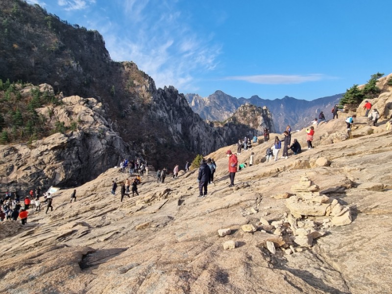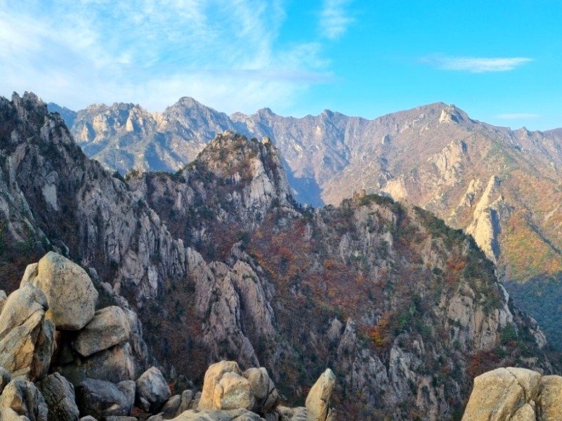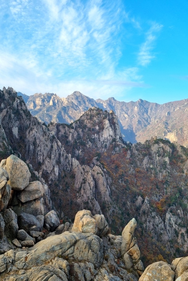 간식을 챙겨 먹고 배를 조금 채우고 자리를 털고 일어나 다시 설악산을 돌아 보았다. 우리가 간식을 먹는 사이 해가 하늘 위로 더 떠올랐는지 어두웠던 봉우리들에 훤한 빛이 스며들기 시작했다. 아침 햇살을 받으니 기암 사이에서 피어난 아름다운 단풍들이 더 돋보였다.