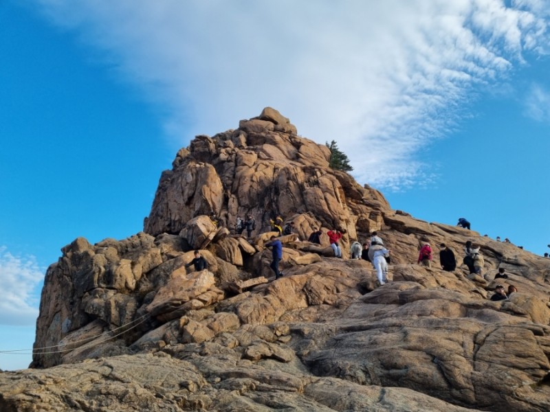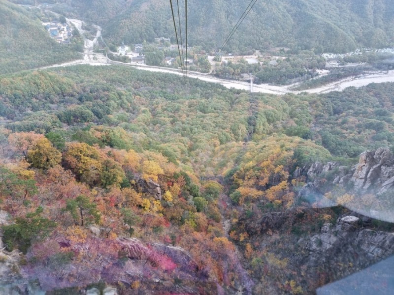 알록달록 푸르른 소나무들과 노랗게 붉게 물든 나무들이 암산을 수놓았다. 멀리 삼각뿔 모양으로 뾰족하게 솟아 오른 장군봉도 보였다. 이렇게 멋진 풍경을 힘들이지 않고 케이블카를 타고 와서 쉽게 볼 수 있어 세상에 감사했다. 케이블카가 생기기 전에 태어나 자랐더라면 이런 비경을 평생 보지 못했을 것만 같다.