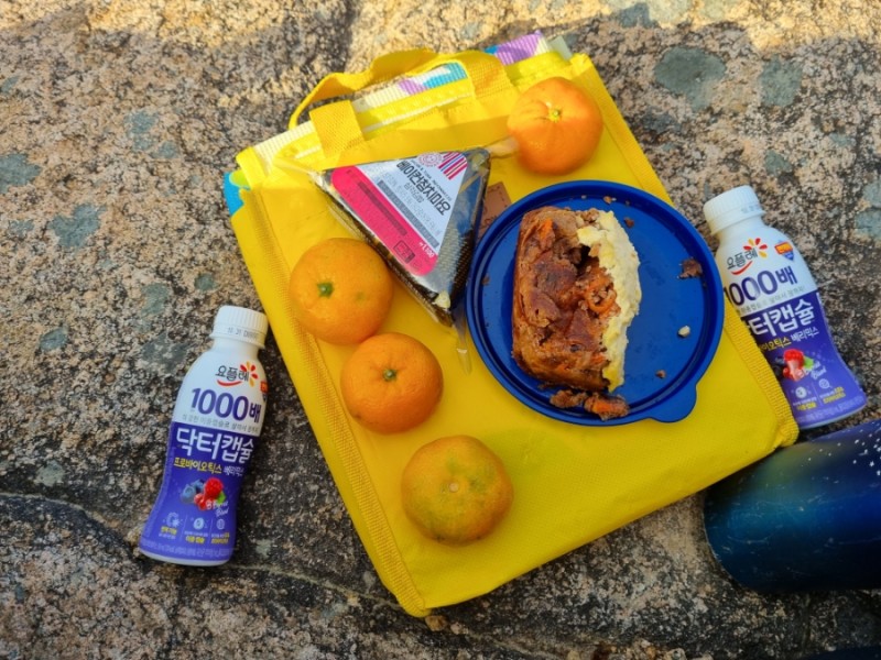높은 곳에 올라서서 한참동안 설악산 비경을 구경하다가 넓적한 바위 위에 앉아 간식을 까먹었다. 어젯밤 미리 사놓은 요거트 음료와 귤, 그리고 남편이 집에서 만들어 온 두부로 만든 당근케이크와 어두운 새벽 펜션에서 직접 내려온 따뜻한 커피. 진수성찬이다.