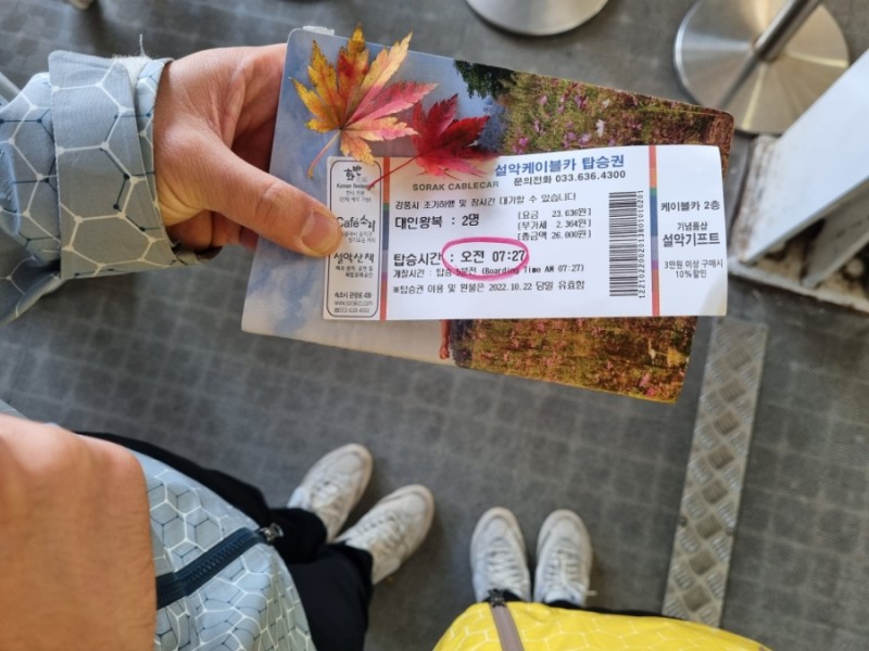 가을 설악산을 만나기 위해 새벽부터 부지런히 출발한 결과, 소공원 주차장에 주차 성공! 케이블카 매표소로 가서 줄을 좀 서다가 오전 7시 27분에 탑승하는 표도 끊었다.