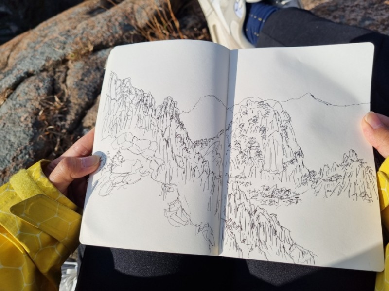 이 멋진 순간을 기념하고 싶어서 일기장을 펼치고 펜을 꺼내 후루룩 눈앞의 풍경을 그림으로 담았다. 손이 시려와서 도중에 멈추고 말았지만, 나중에 일기장을 들춰보면 지금 이 순간이 떠오르겠지, 그런 생각이 드니 웃음이 나왔다.