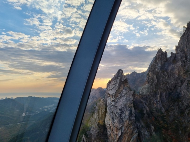 케이블카를 타고 올라가며 창밖으로 멀리 울산 바위가 보이고 반대편 먼 곳으로는 해가 떠오르는 하늘과 푸르른 바다도 보였다. 그리고 케이블카 아래로는 알록달록한 가을산의 풍경이 펼쳐졌다. 두근두근, 올라가면 얼마나 더 멋있는 풍경이 펼쳐질지 기대 만발이었다.