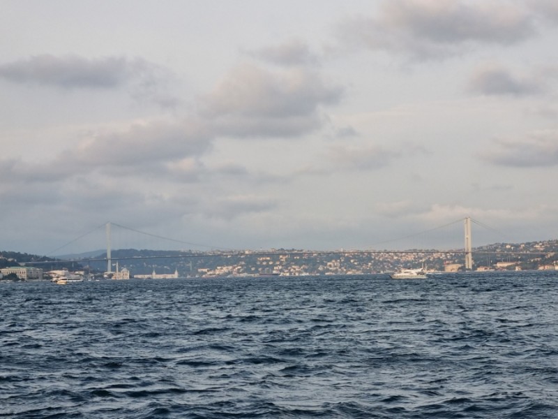 배는 점점 더 앞으로 나아가서 보스포루스 다리와 가까워졌다. 아시아와 유럽을 잇는 보스포루스 다리는 멀리서 볼 때와 달리 그 크기가 엄청났다. 지도에서 보스포루스 해협을 보면 참 좁아 보였는데 실제로 보니 엄청 넓었다. 유람선은 이 커다란 다리 아래를 지나갔다.
