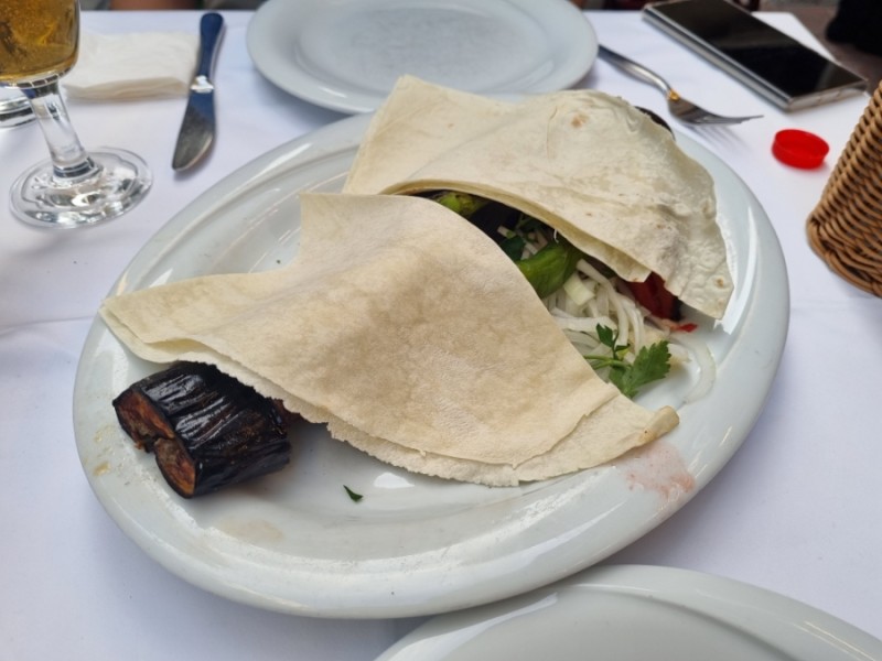 주문한 메뉴 중 가지케밥이 먼저 나왔다. 얇은 빵이 위에 얹어져 있었는데 안에 고기나 야채를 넣고 돌돌 말아서 먹었다. 빵을 걷어내니 잘 구워진 야채와 고기가 참 먹음직스러워 보였다.
