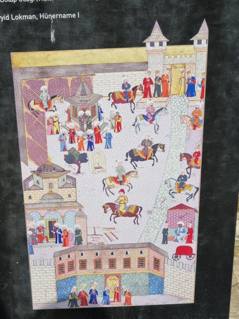 톱카프 궁전의 옛 모습이 어떨지 보여주는 그림 한 점이 입구에 있었다. 낯선 의복들에 먼저 눈이 갔는데 옷 색깔이 각기 다르고 화려하며 하얀 터번을 머리 위에 얹은 모습이 눈에 띄었다.