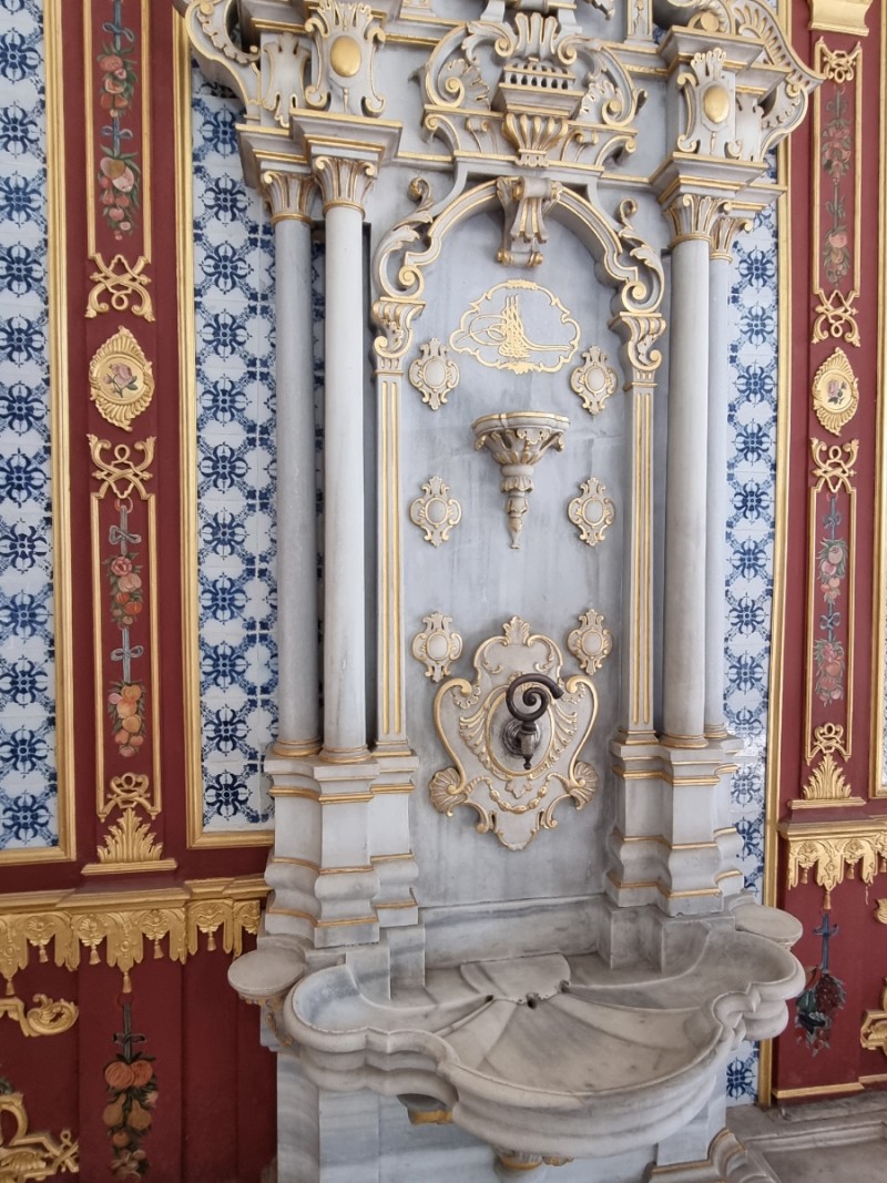 수도 꼭지가 달린 손을 씻는 곳도 어찌나 화려하던지 모른다. 대리석을 깎아 기둥과 여러 장식적인 문야을 만들어 내고, 그 위로 금빛 칠을 해서 개수대를 화려하게 꾸몄다.