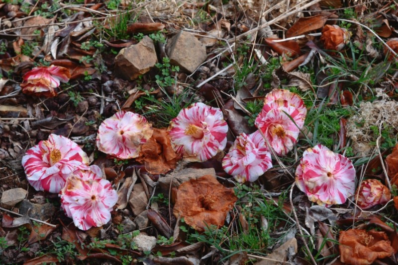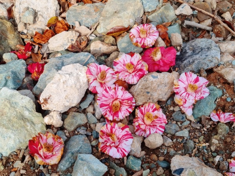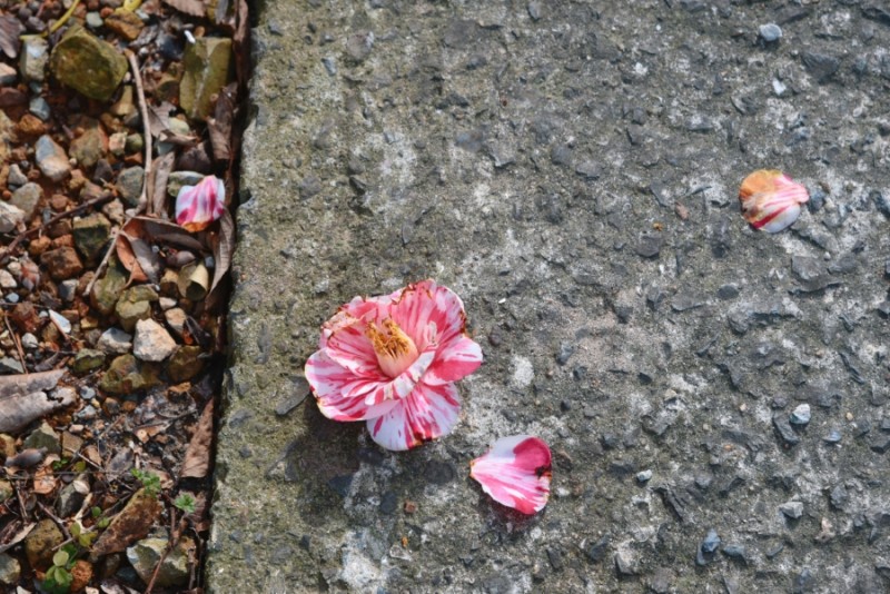 동백꽃은 떨어진 모양도 아름답다.큼지막한 꽃이 숭덩 땅 위로 떨어져서, 마치 땅 위에서 다시 피어난 것 같다.
