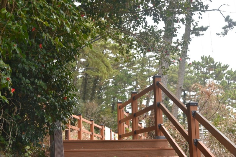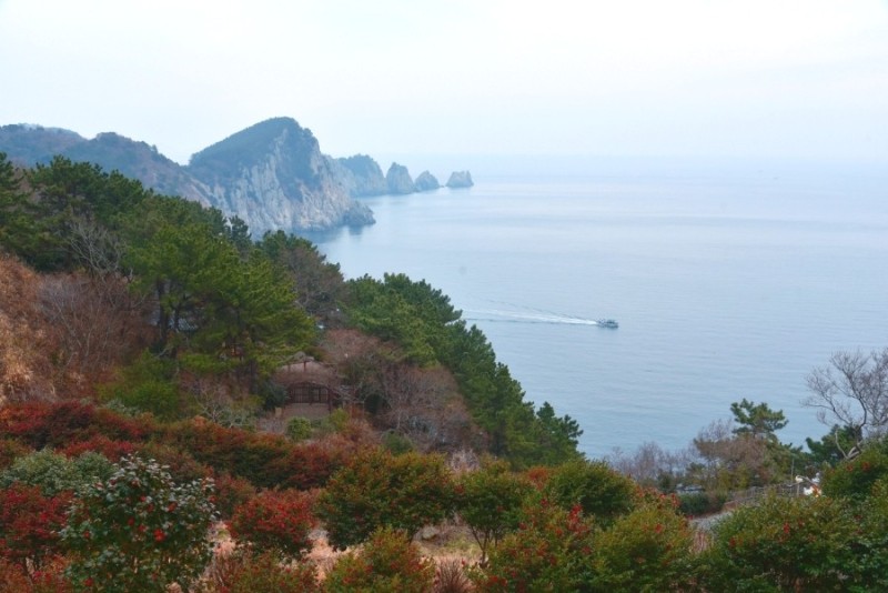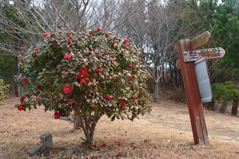 멀리 멋드러진 바위가 보이고 우리 발 아래에는 가득 핀 동백꽃들 천지였다.