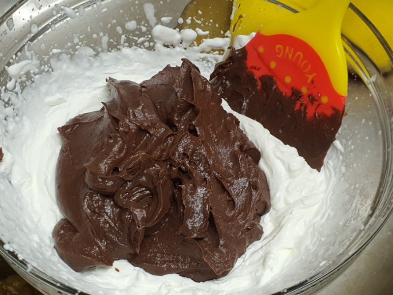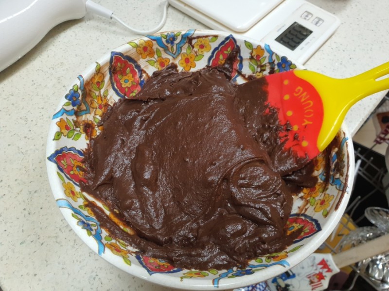 초코파우더, 다크초콜릿, 우유, 달걀노른자, 버터 등 넣고 냉동실에 냉각시켜둔 초코크림과 생크림을 섞어주고 (재료 계량은 아래에 따로 정리해서 적어 놓았다.)