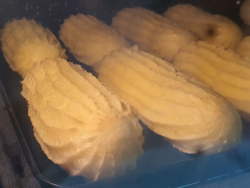 구울땐 잘구워지는듯하다가 한마리만 유독 반죽이 주저앉아버렸다. 전부 주저앉았으면 호화잘못이라고 생각하겠는데 한마리만 주저앉은걸 보니 반죽 짜면서 어딘가 구멍이 난건지.. (참고로 와이프가 짠 반죽이다. 상단 5번 반죽이었던걸로 기억한다.)