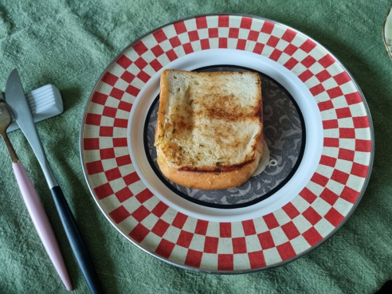 가염버터로 구운빵 + 백명란 1개 크림치즈가 내 입맛엔 짠것같아서 무염버터로 구운빵에 남은 명란크림치즈 넣어서 먹으니 이제서야 간이 딱 적당했다.